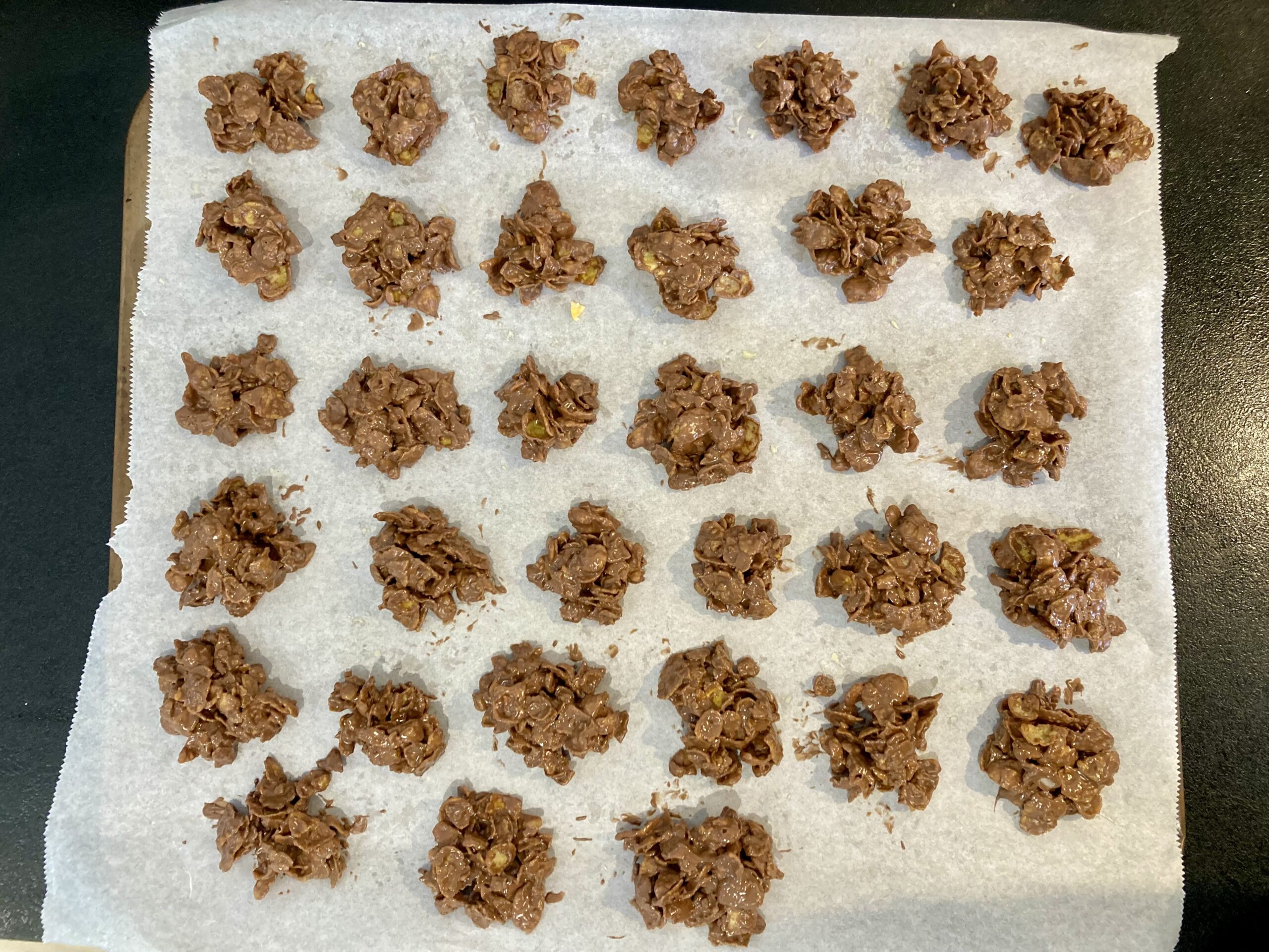 3. Sur une plaque/un plat recouvert(e) de papier cuisson ou d’un tapis en silicone déposez de petits amas de préparation (par exemple avec une cuillère à café) pour former les roses des sables.