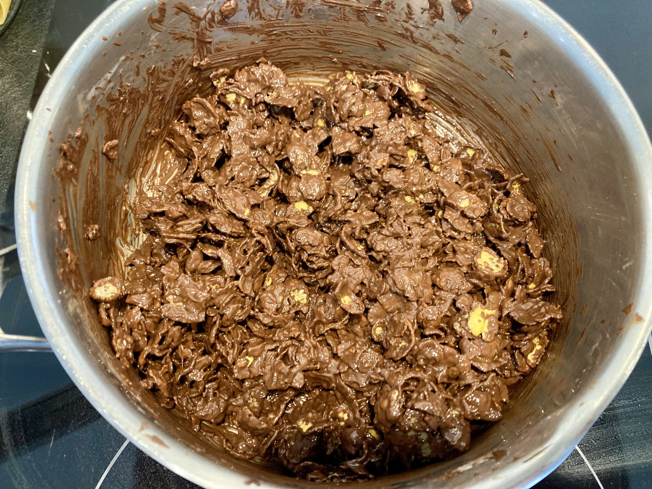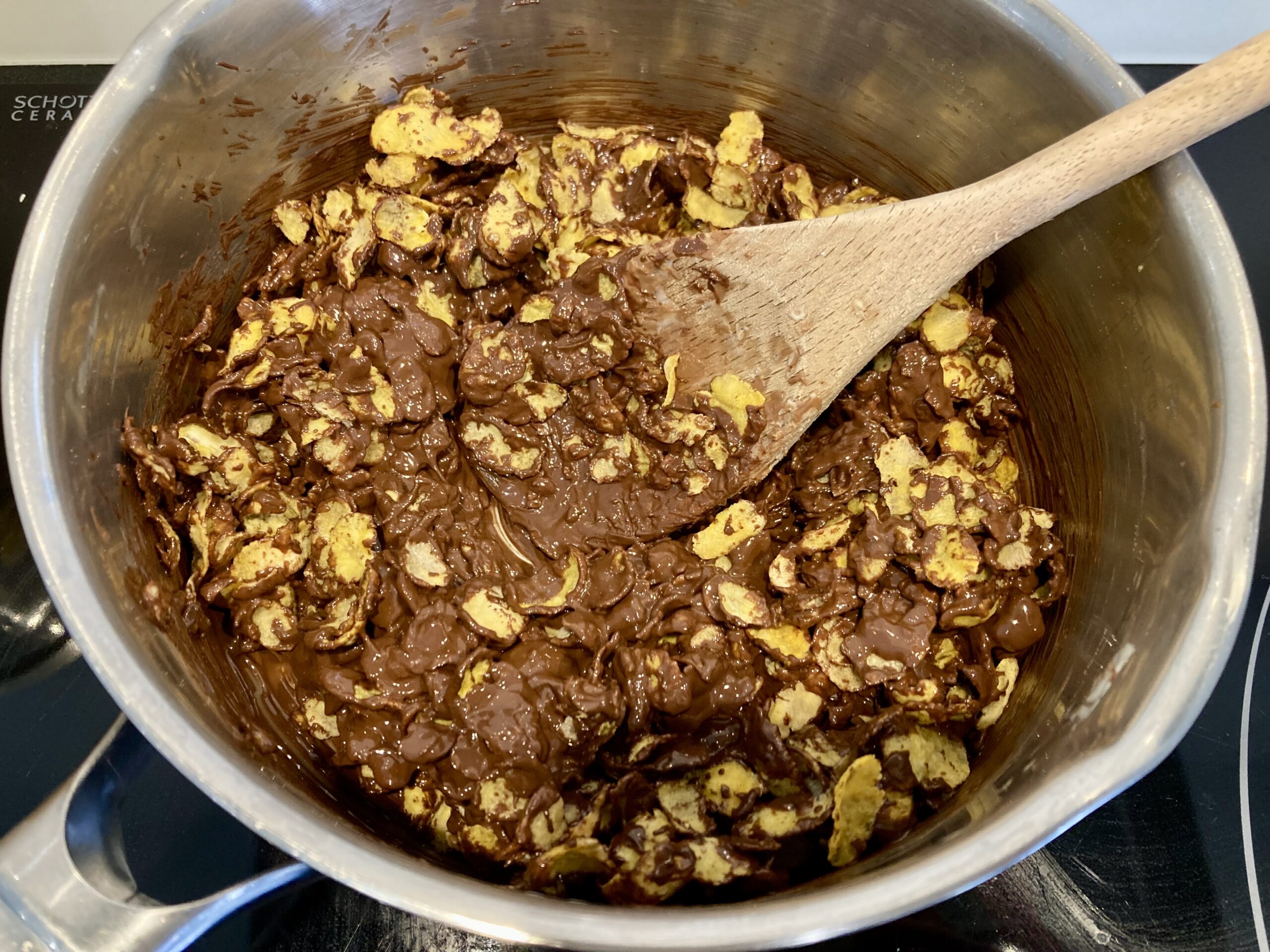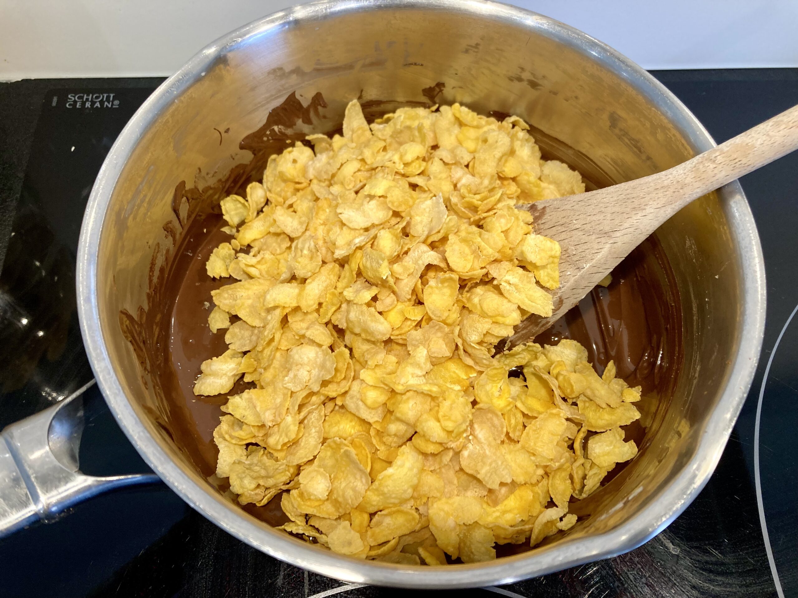 2. Une fois le chocolat fondu hors du feu ajoutez les pétales de mais et mélangez.