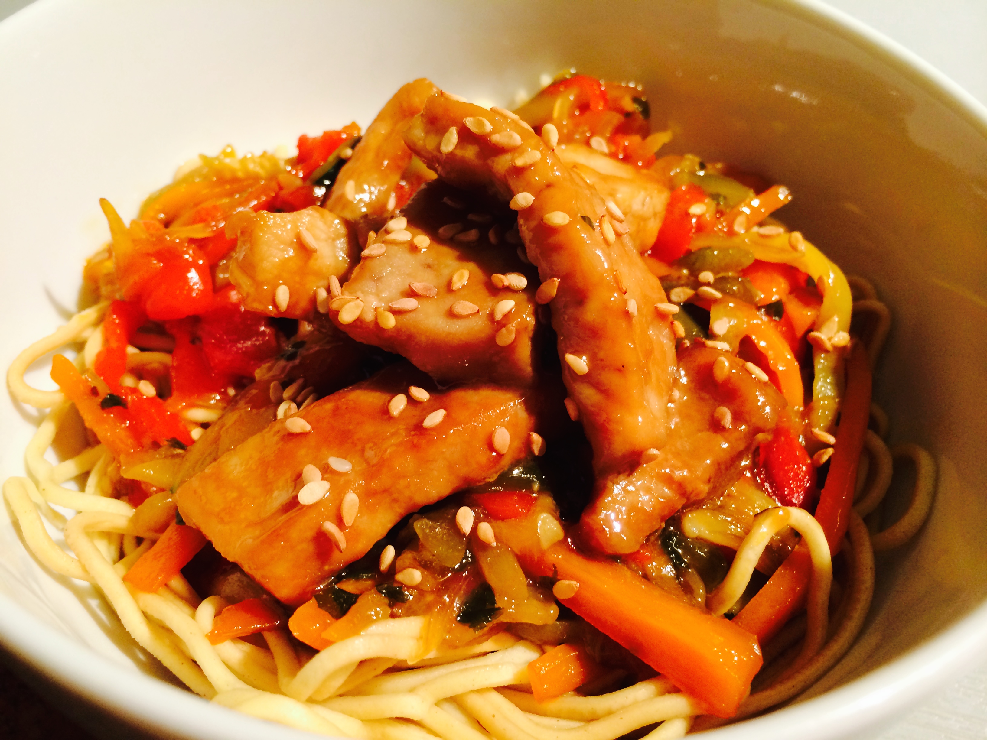 A la fin de la cuisson ajoutez le reste de la marinade, salez, saupoudrez de sésame.