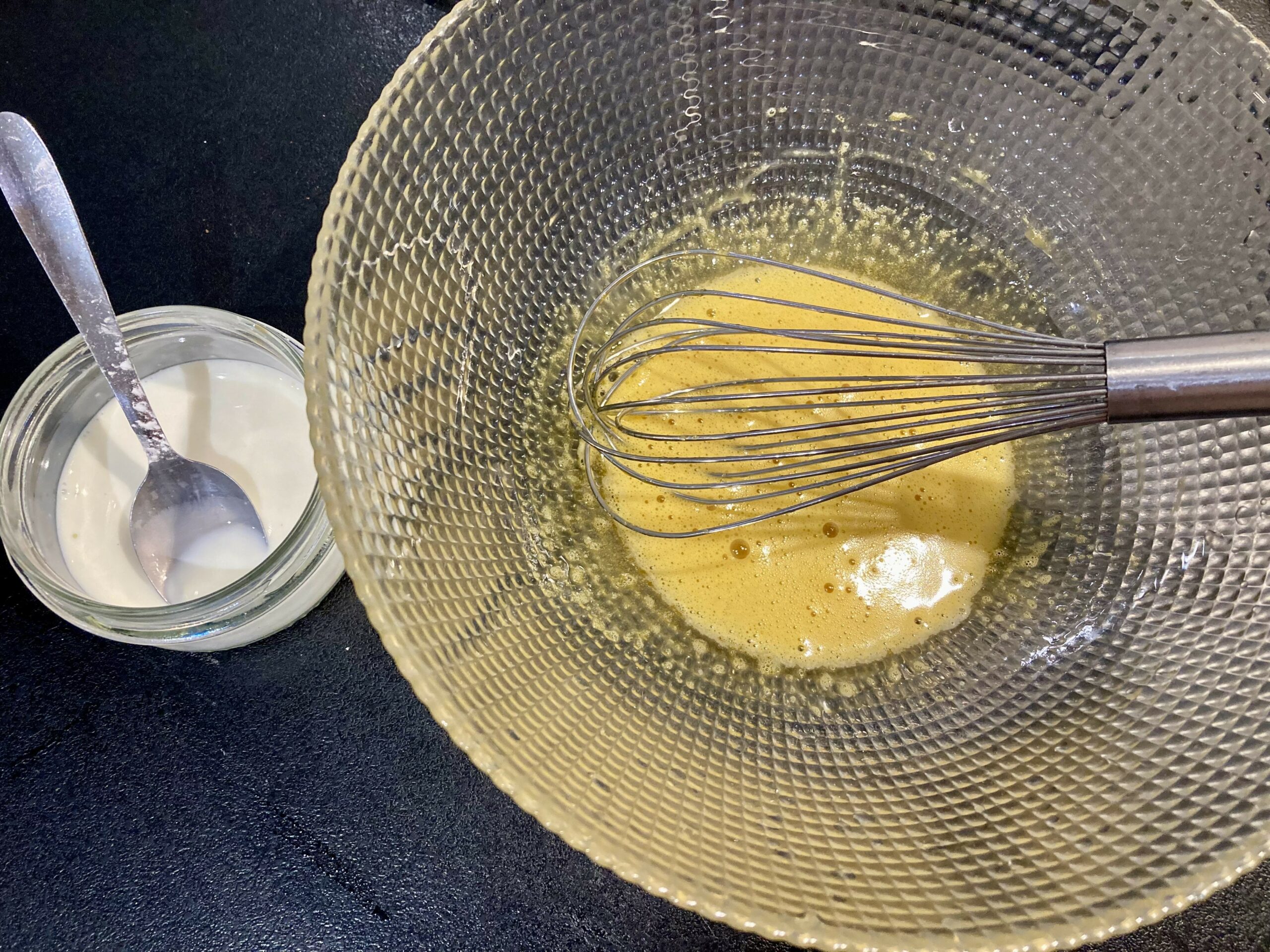 Ajoutez ensuite le lait progressivement cuillère à soupe par cuillère à soupe, jusqu’à obtenir un mélange lisse et homogène.