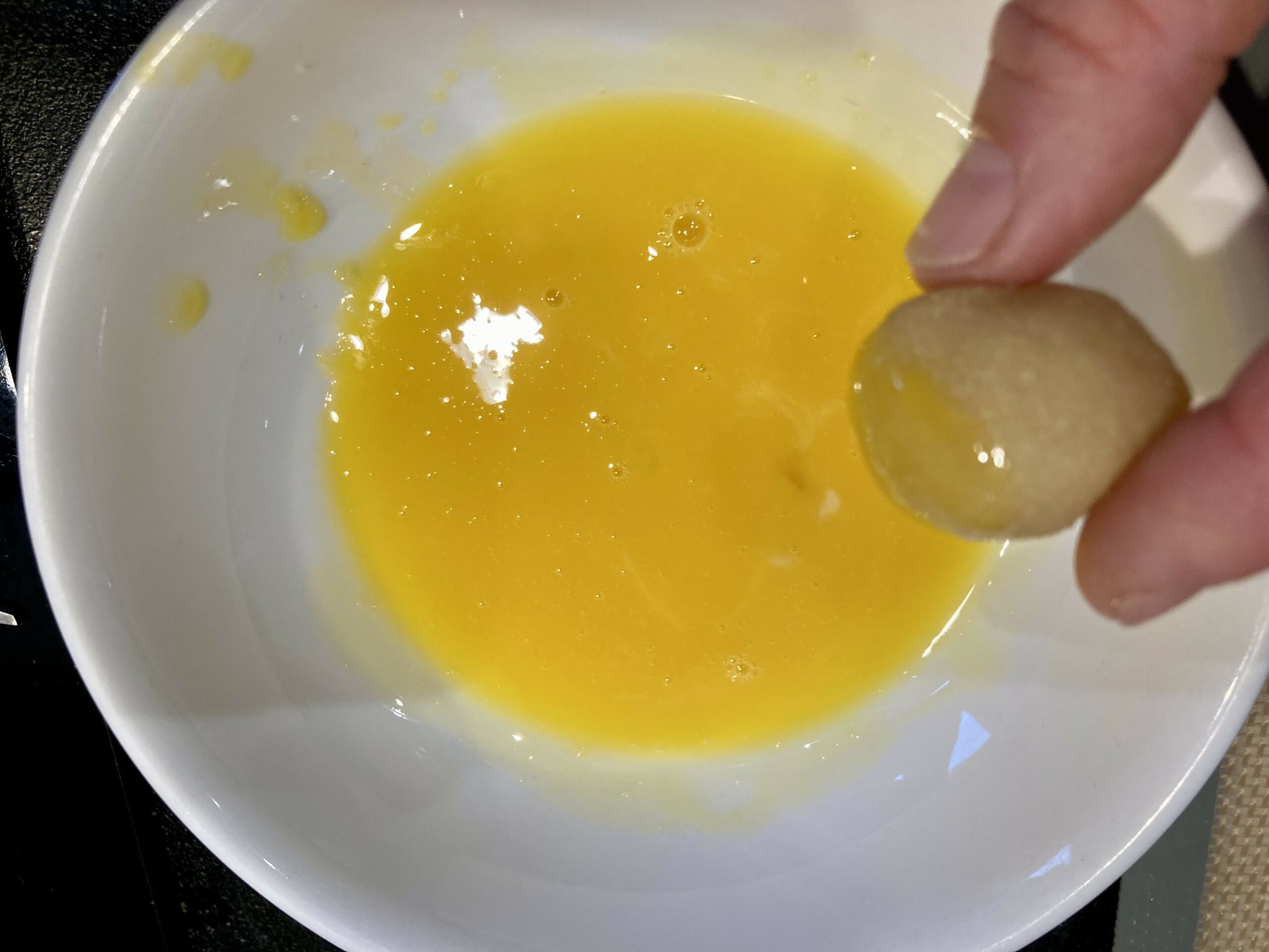 Trempez sur une face une bille de pâte dans le jaune d’oeuf, puis faites-la rouler entre les paumes de vos mains pour répartir le jaune d’oeuf tout autour de la bille.