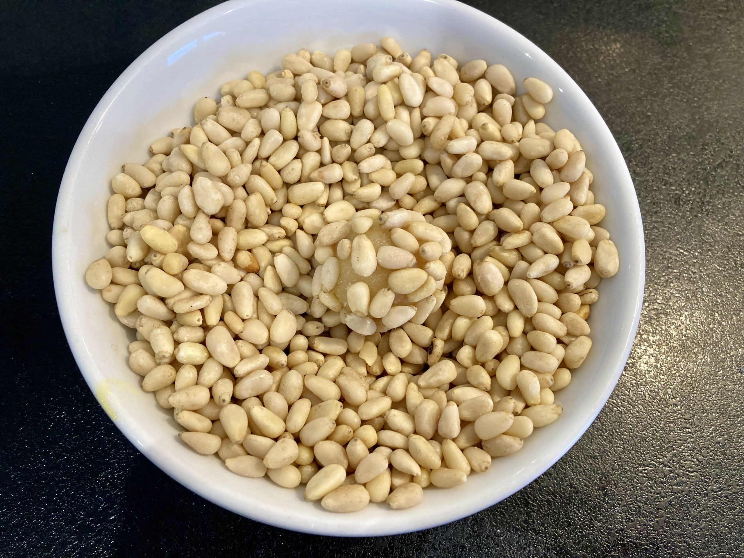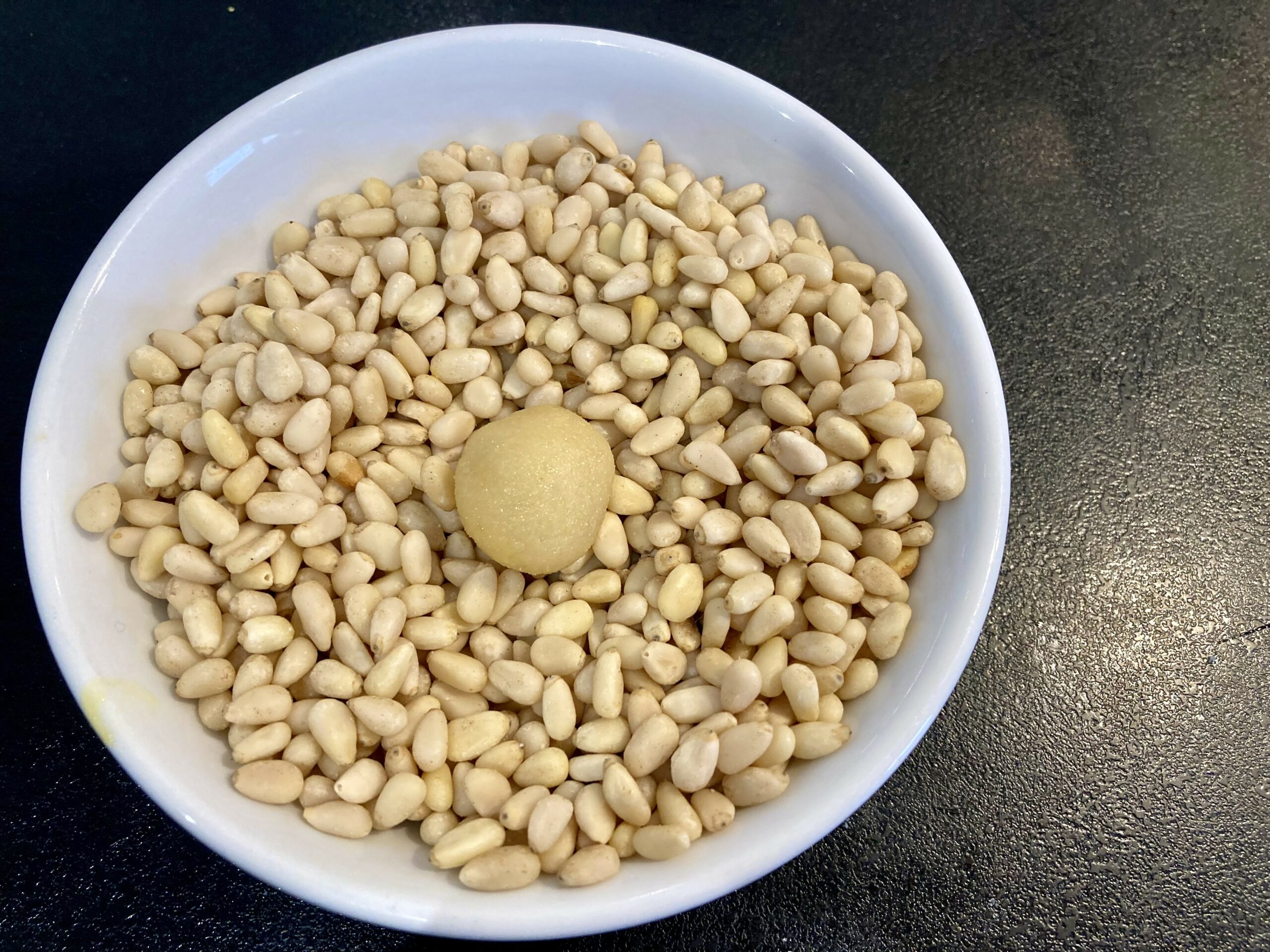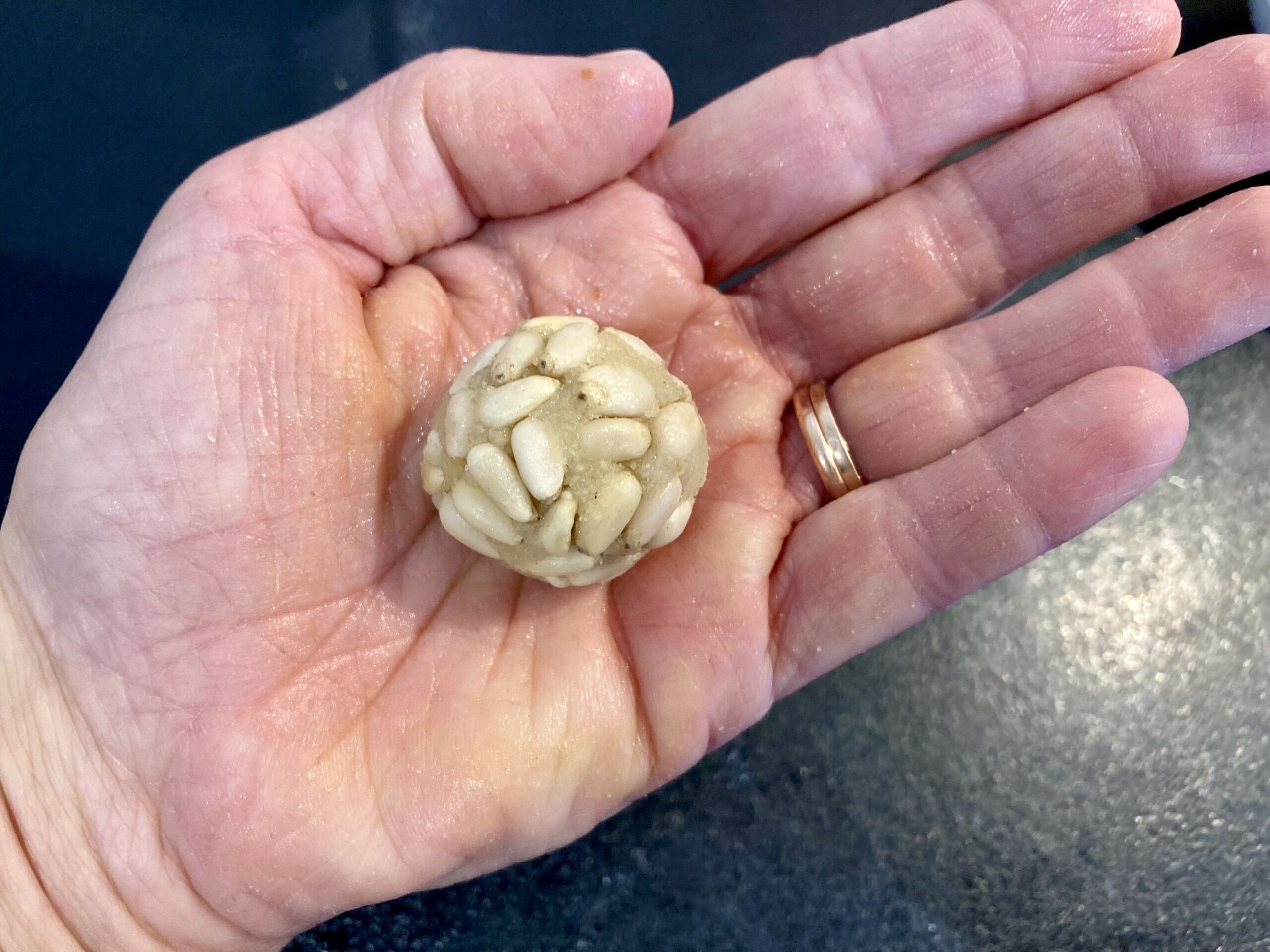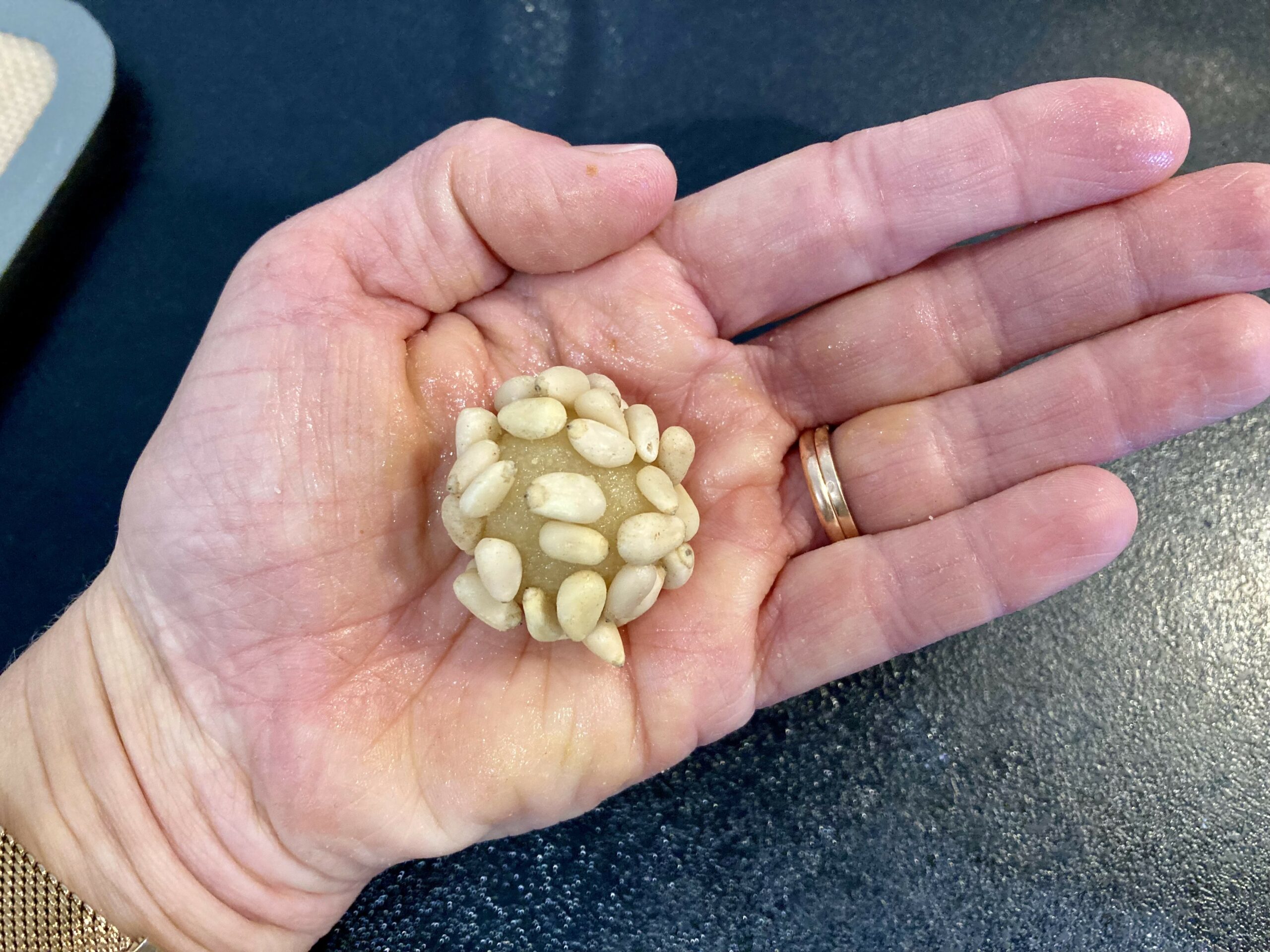 Ensuite roulez la bille de pâte dans les pignons et pour finir de coller les pignons à la pâte roulez de nouveau entre les paumes de vos mains (sans trop appuyer sinon les pignons vont entrer à l’intérieur de la pâte et non rester en surface).
