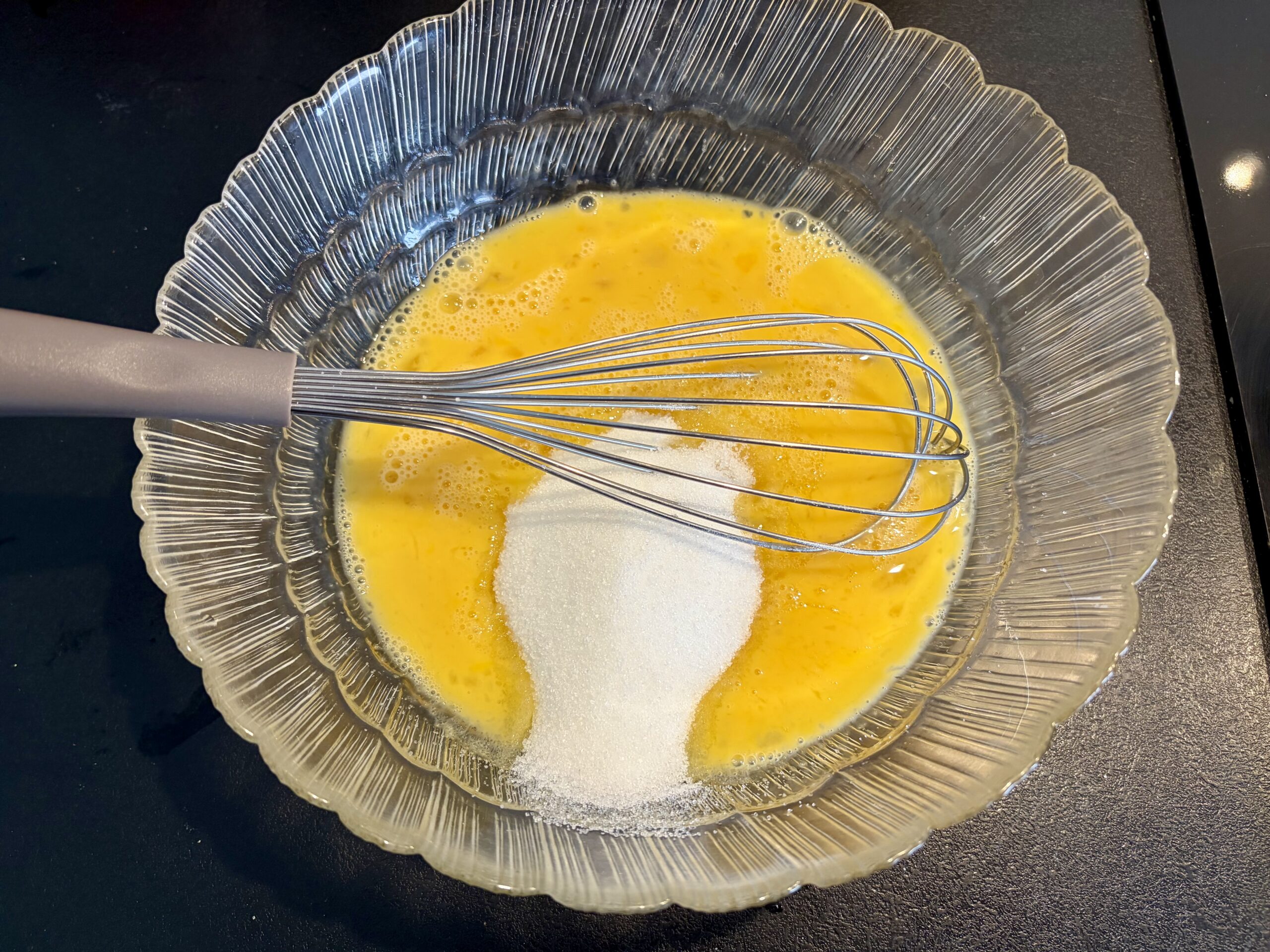 - Dans un récipient ajoutez les oeufs et le sucre. Fouettez légèrement.