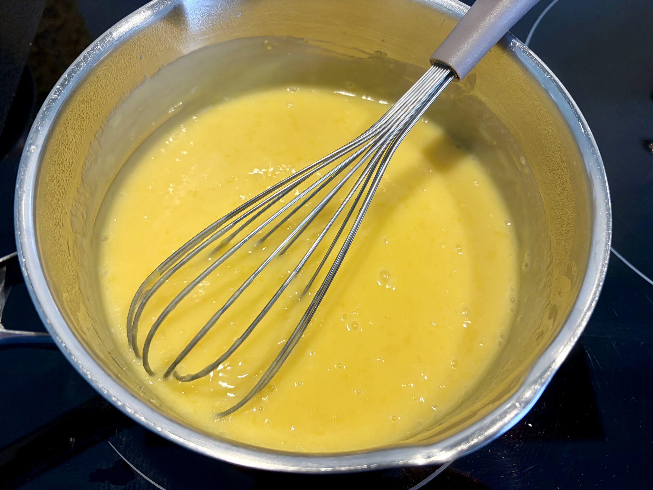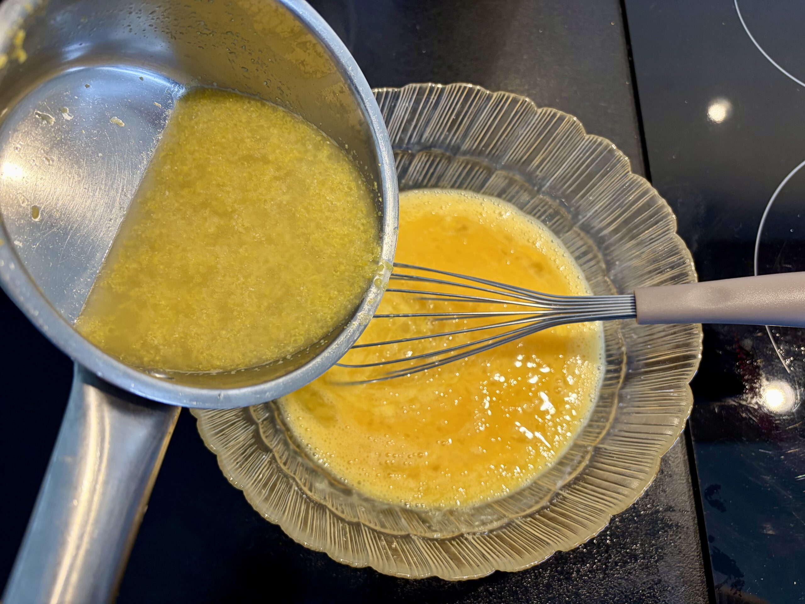 - Retirez du feu et versez en filet sur les oeufs, en fouettant vivement afin de ne pas les cuire.