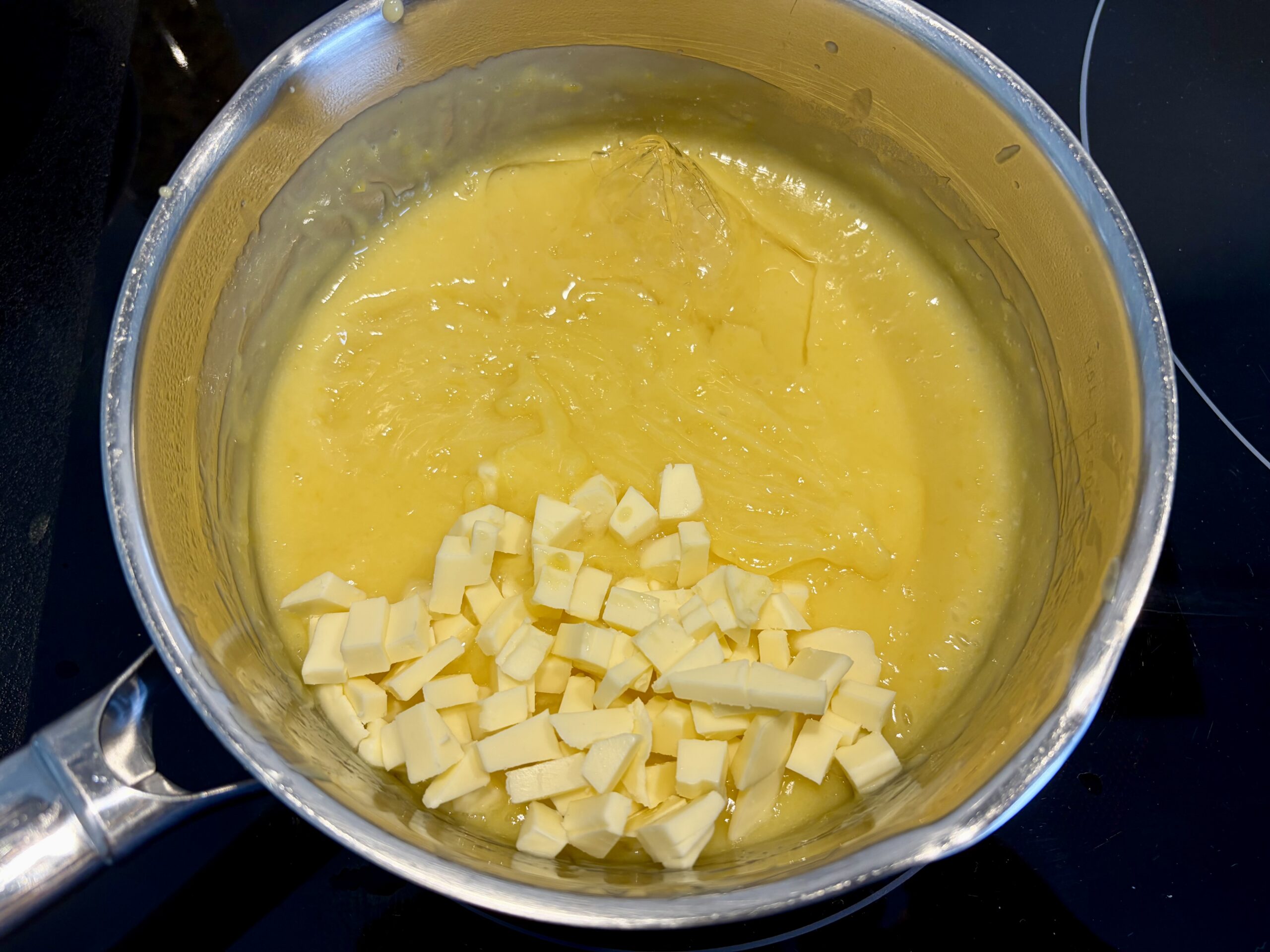 - Hors du feu, ajoutez le beurre coupés en morceaux et la gélatine essorée puis mélangez jusqu’à obtenir un crémeux lisse et homogène.