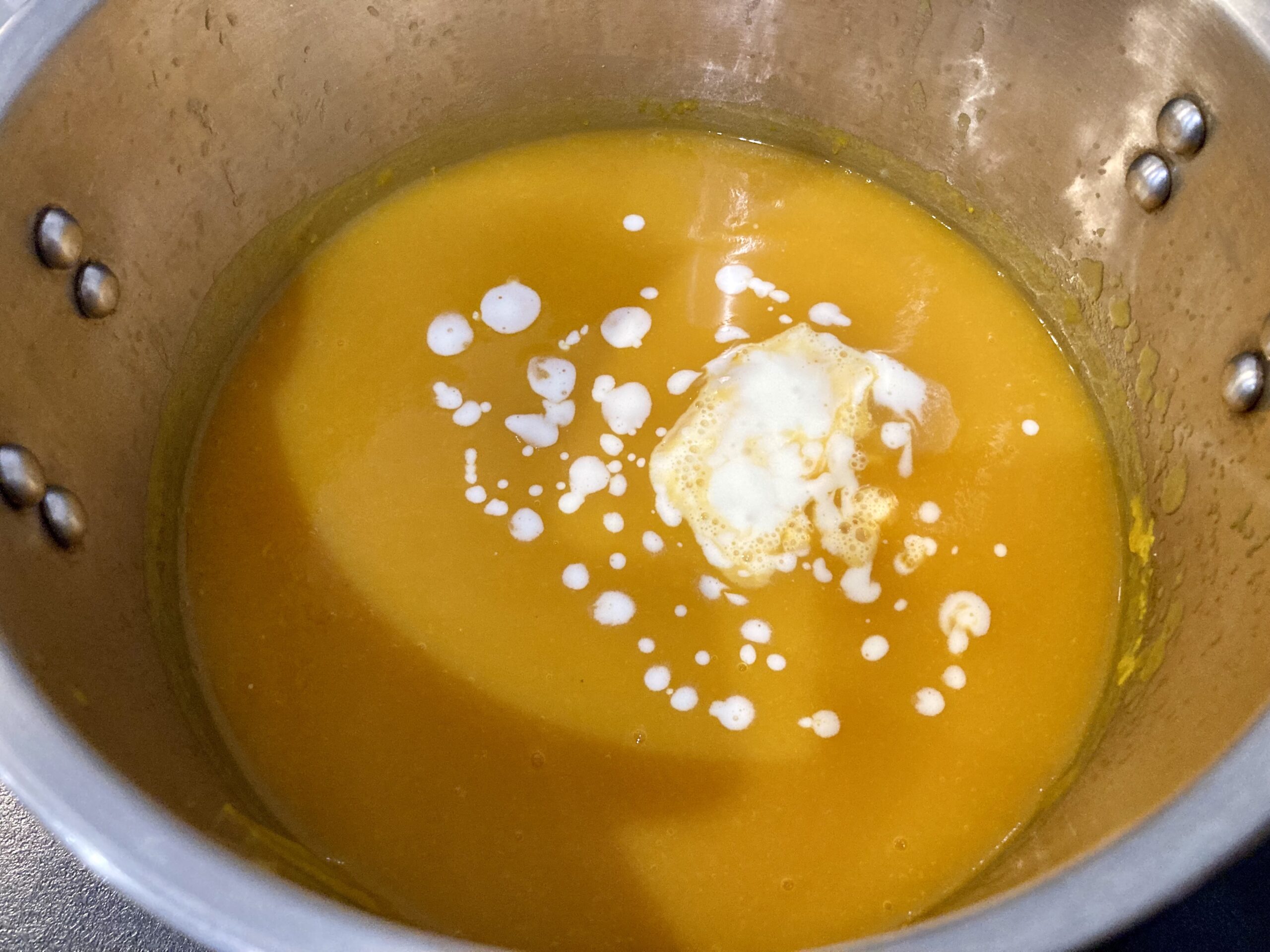 4. Ajoutez la crème liquide. Goutez et rectifiez l’assaisonnement en fonction de vos goûts.