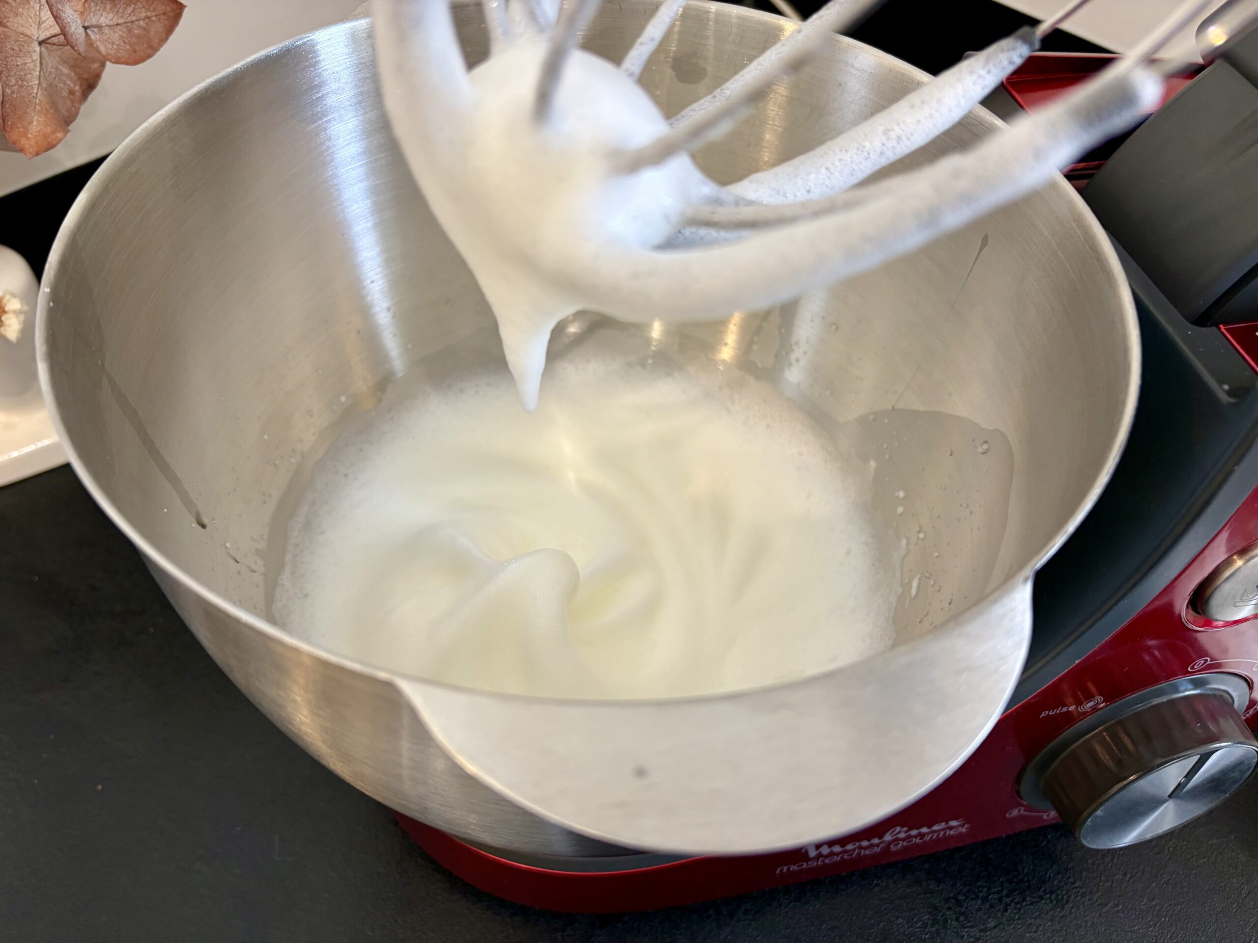 - Montez les blancs en neige (lorsque vous soulevez le fouet, la pointe doit retomber légèrement). Ne les battez pas trop, sinon ils s’incorporeront moins bien et la pâte perdra de sa légèreté.