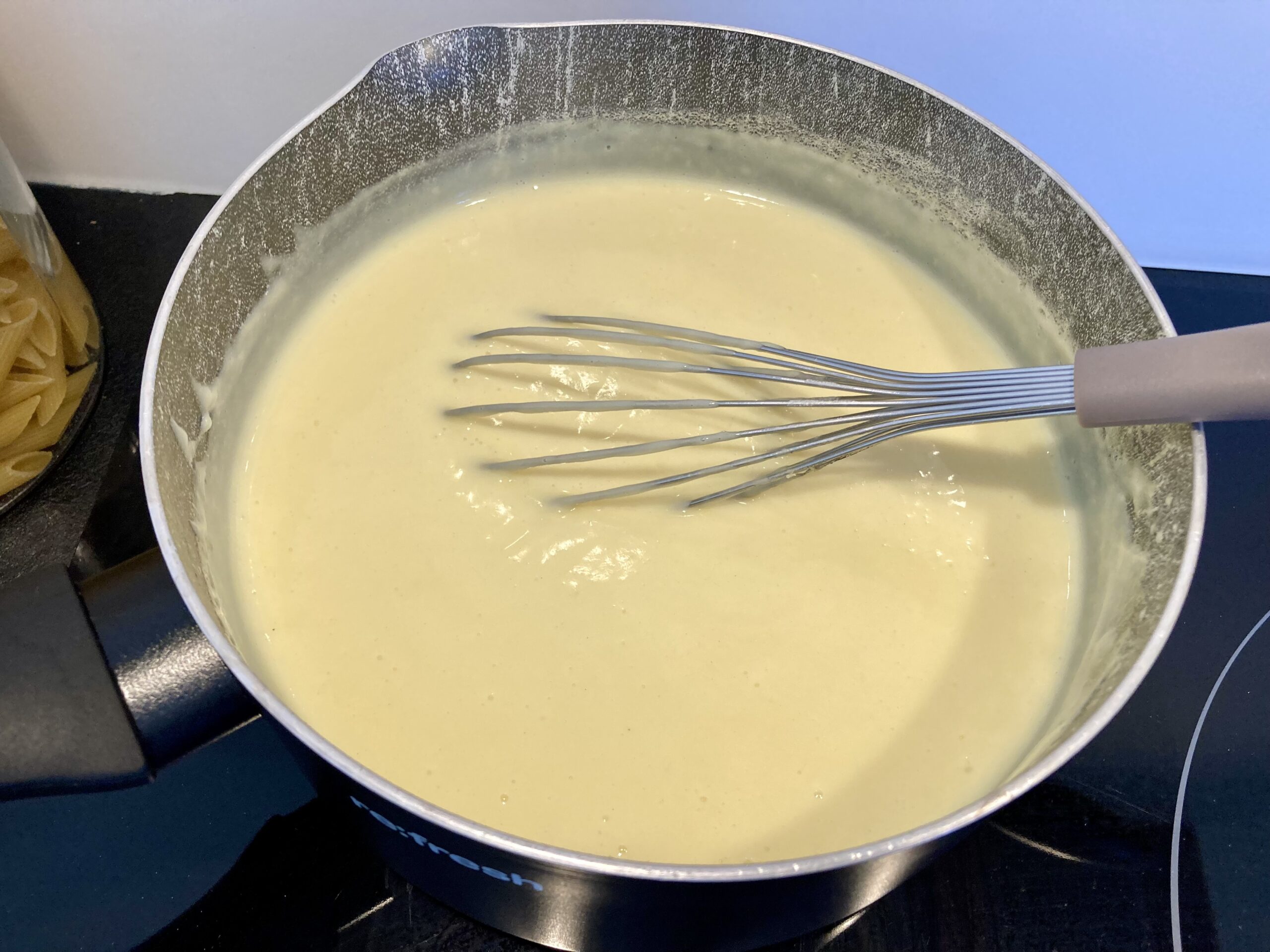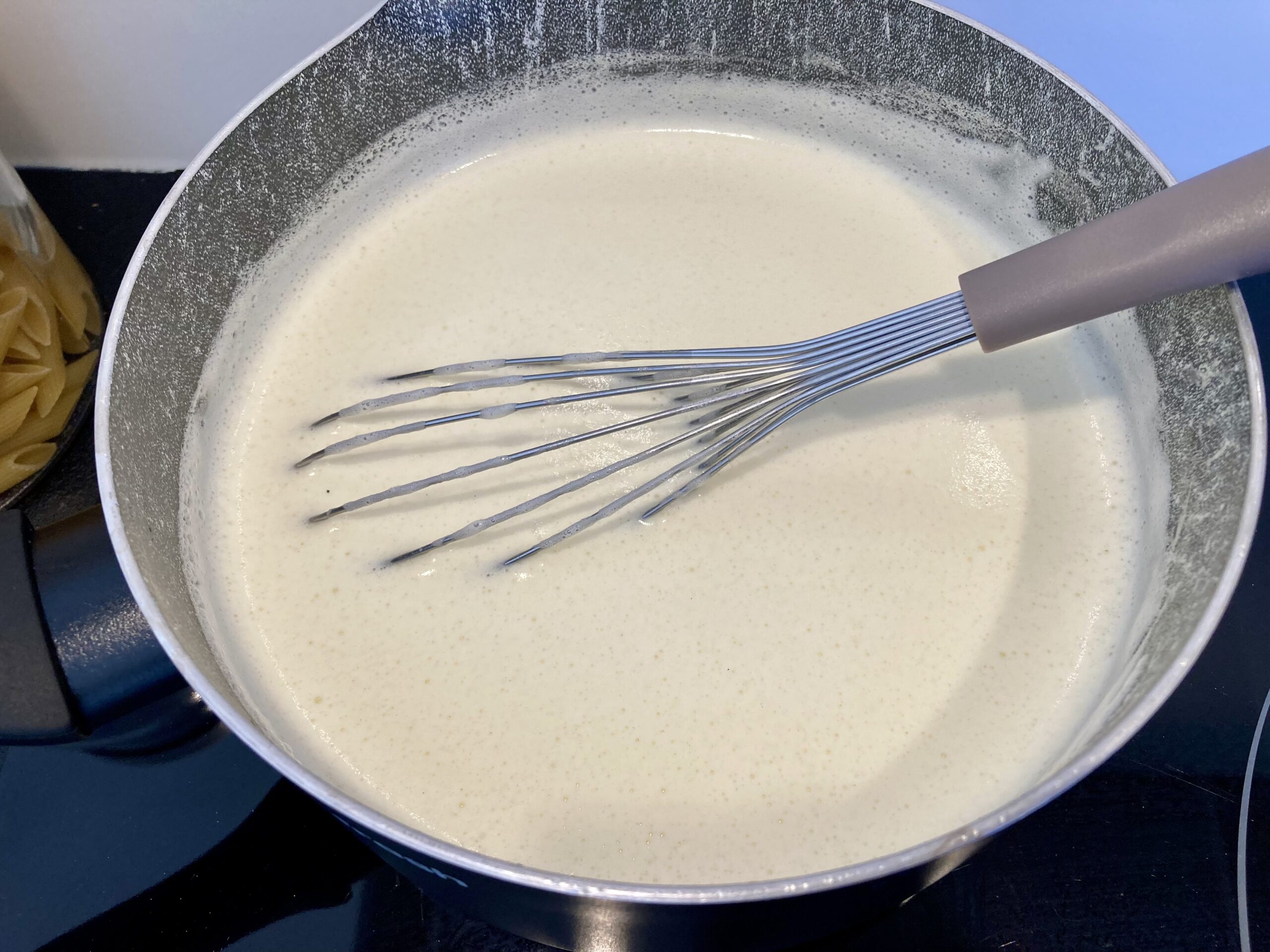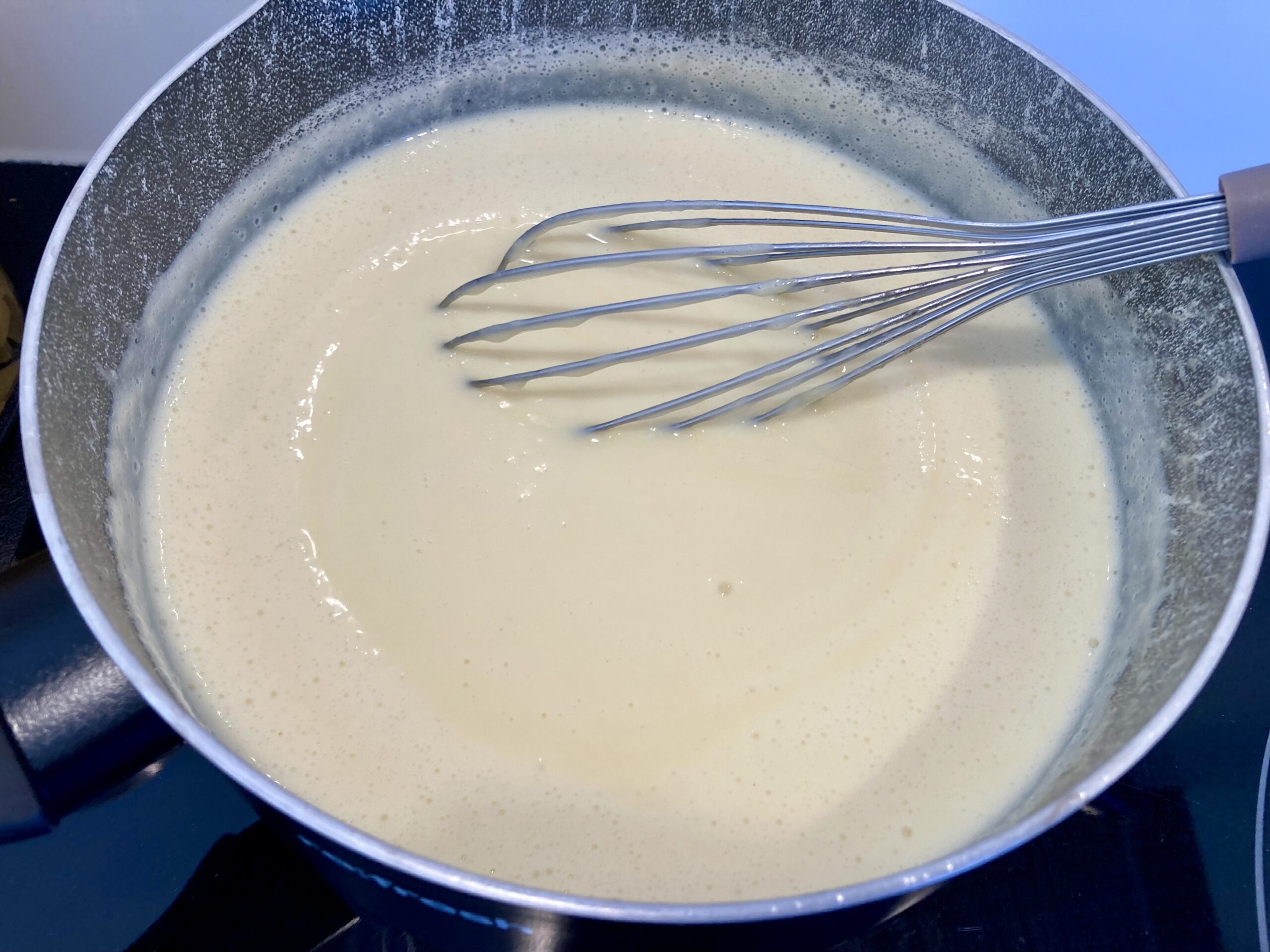 7. Remettez le mélange oeufs/crème-lait dans la casserole et faites cuire en remuant continuellement sur feu moyen jusqu’à ce que le mélange épaississe. Une fois le mélange épaissi, ajoutez l’arôme vanille (si utilisé) et poursuivez la cuisson 1 minute (pour que la maïzena soit bien cuite).