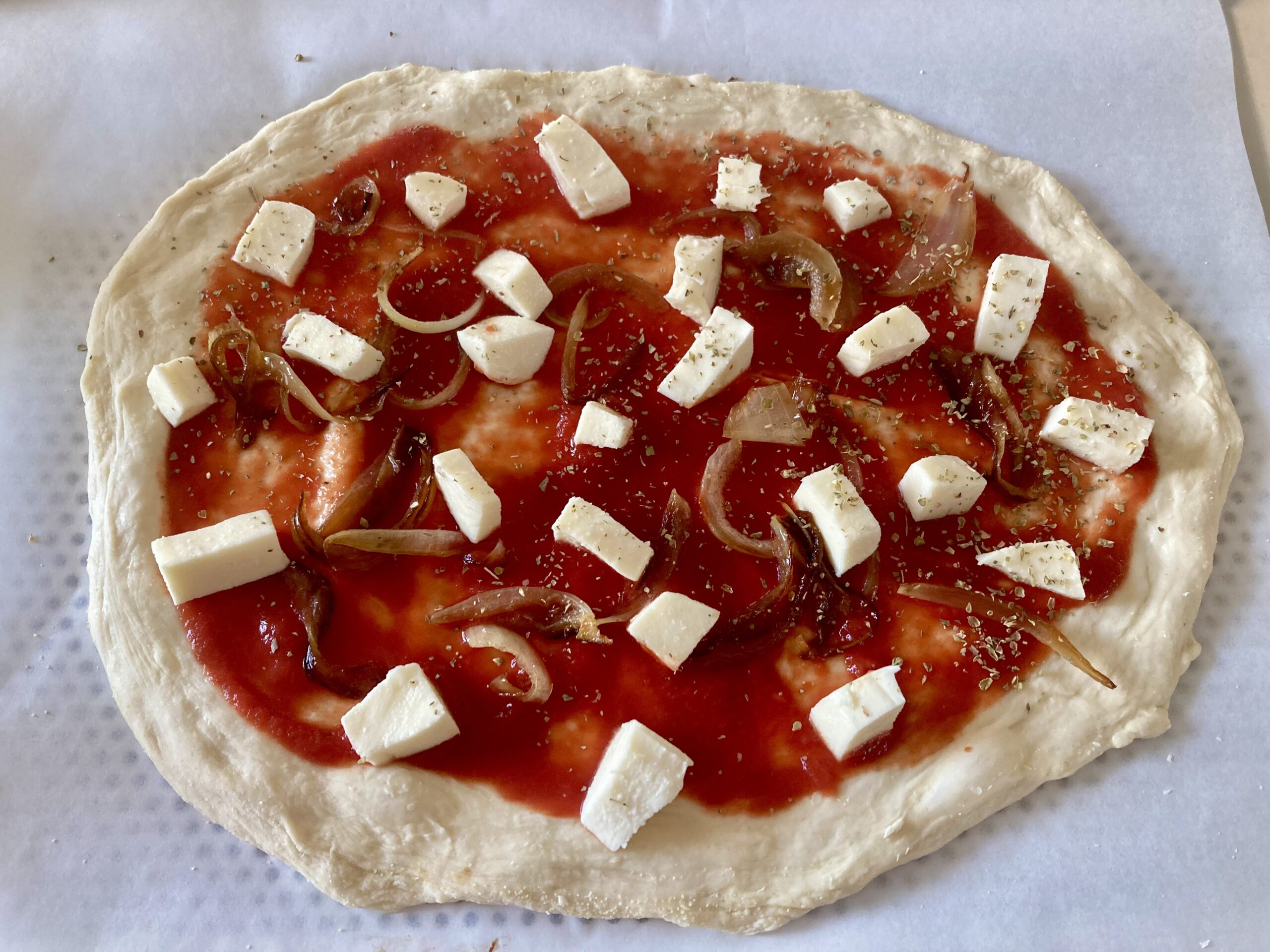 Ajoutez les oignons, des cubes de mozzarella et saupoudrez d’origan.