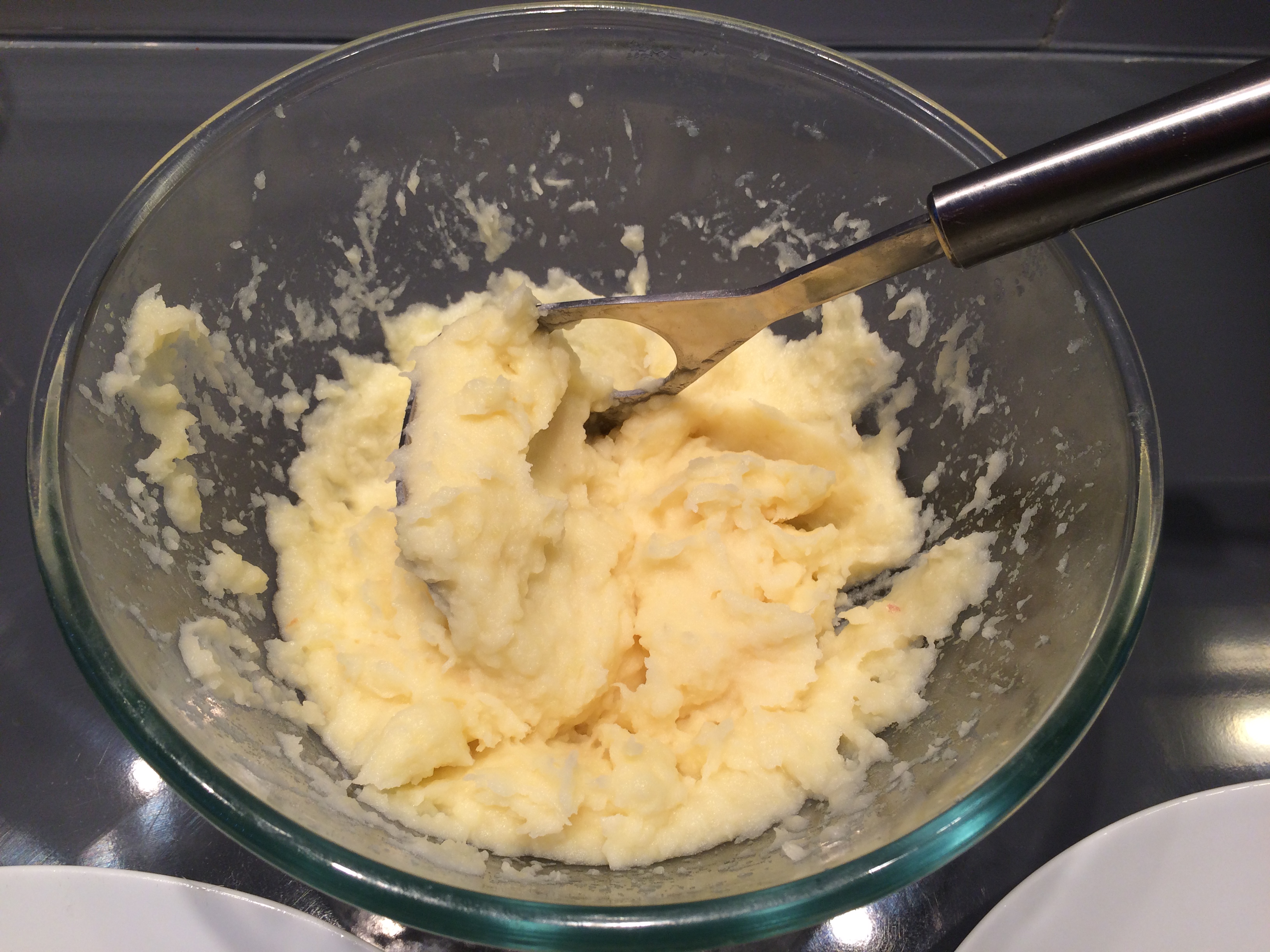 5. Mettre les pommes de terre dans un récipient. Ajoutez le beurre (il va permettre de lier la purée). Avec un presse purée (ou une fourchette, mais c’est plus sportif!), écrasez les pommes de terre. Attention: ne jamais utiliser de robot ou de fouet car votre purée deviendrait élastique.