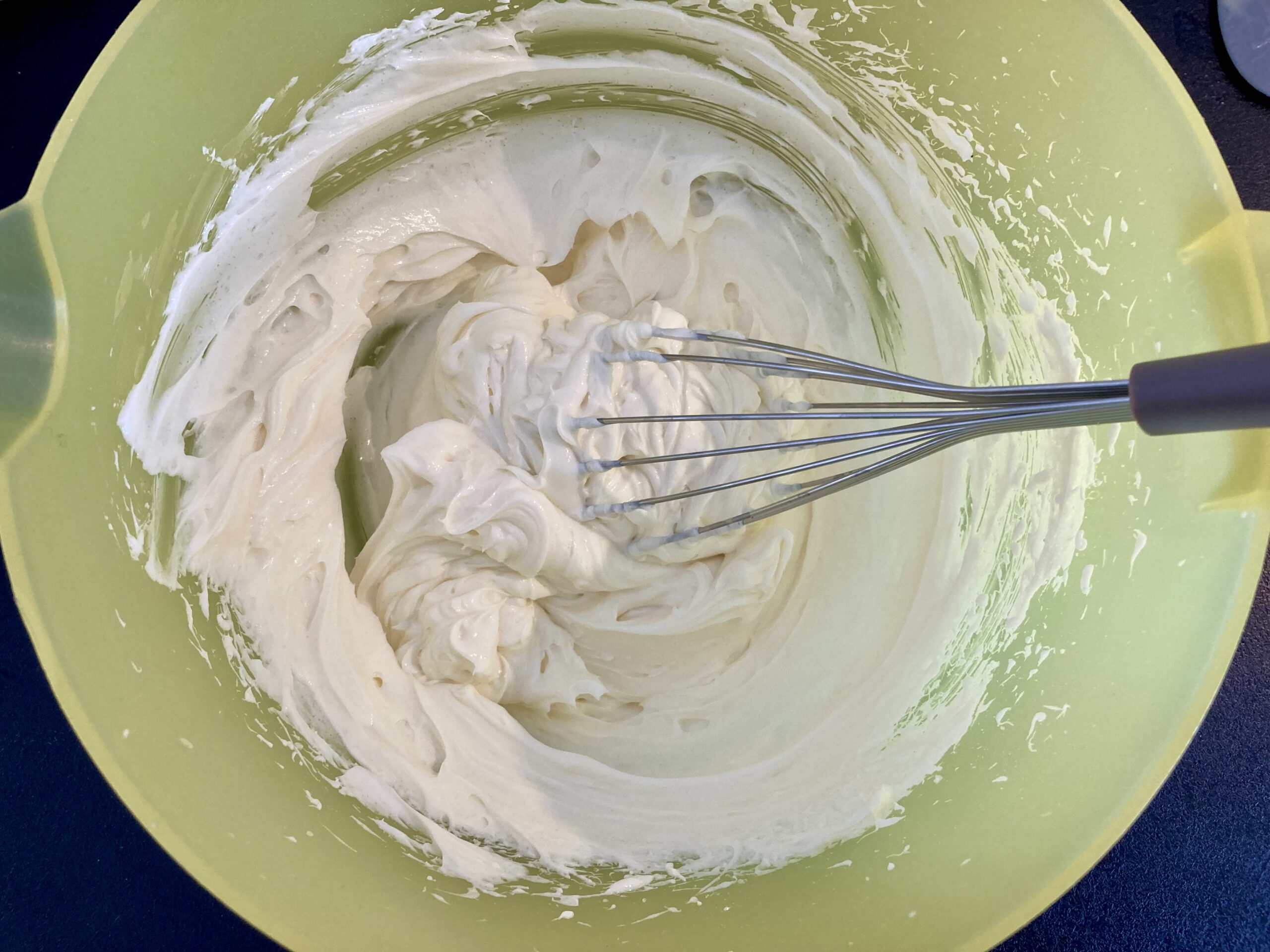10. Sortez la crème et le récipient. Fouettez avec un fouet électrique la crème jusqu’à obtenir une chantilly souple : mousseuse, encore légèrement coulante, avec un bec d’oiseau/pic mou qui retombe doucement. Elle ne doit pas être trop serrée afin de s’incorporer facilement à votre préparation et d’apporter une texture aérienne (une chantilly ferme, à la texture plus dense et au bec d’oiseau/pic droit risquerait d’alourdir la préparation finale).