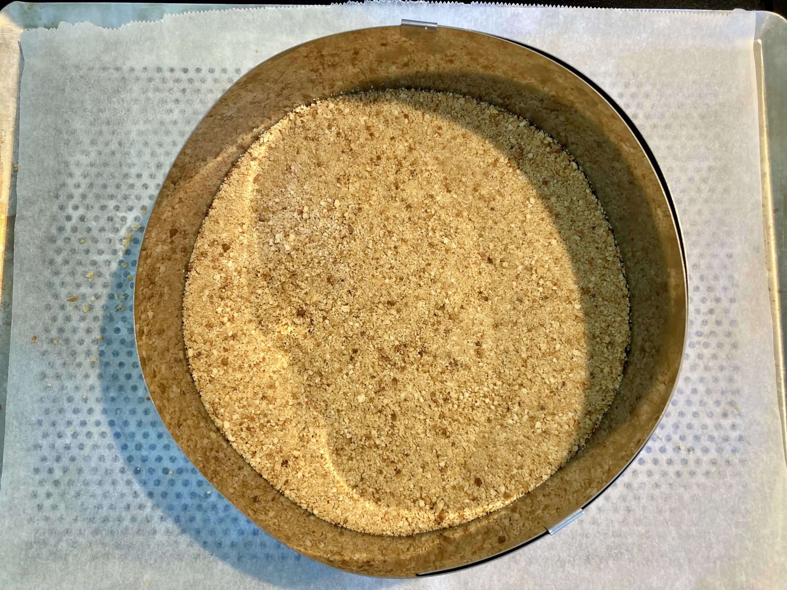 4. Dans le fond d’un cercle amovible ou d’un moule à charnière versez votre mélange et étalez avec le dos d’une cuillère jusqu’à obtenir une couche homogène. (!Attention! si vous utilisez un cercle amovible posez-le sur une plaque de cuisson antiadhésive ou une plaque de cuisson recouverte de papier cuisson ou sur un plat de présentation passant au four; si vous réalisez votre cheesecake dans des verrines assurez-vous que ces dernières passent au four).