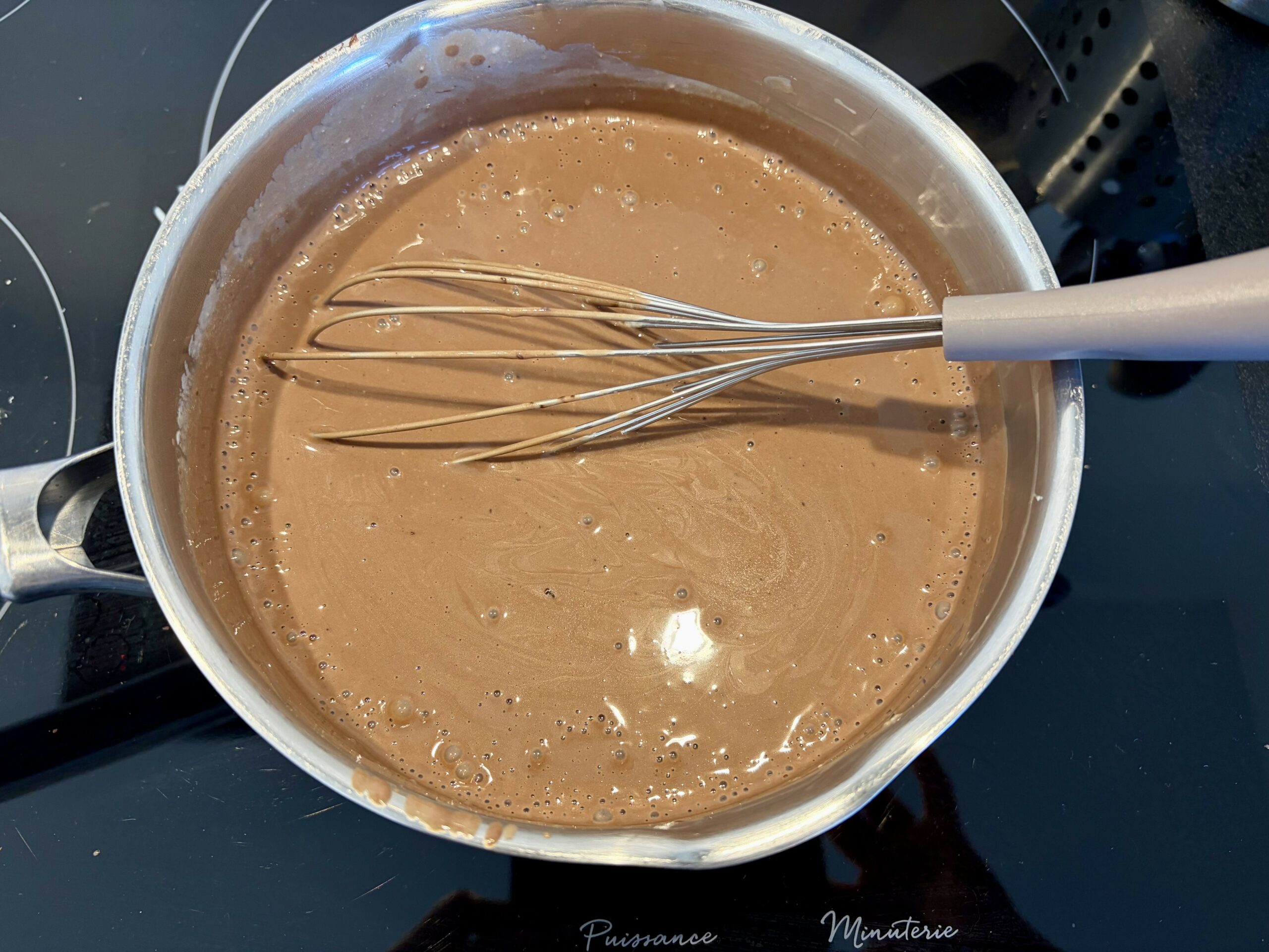 Si vous voulez qu’il y ait de petits morceaux de chocolat dans vos crèmes dessert laissez fondre le chocolat sans mélanger et arrêter le feu un peu avant que le chocolat ne soit complètement fondu (voir troisième photo).