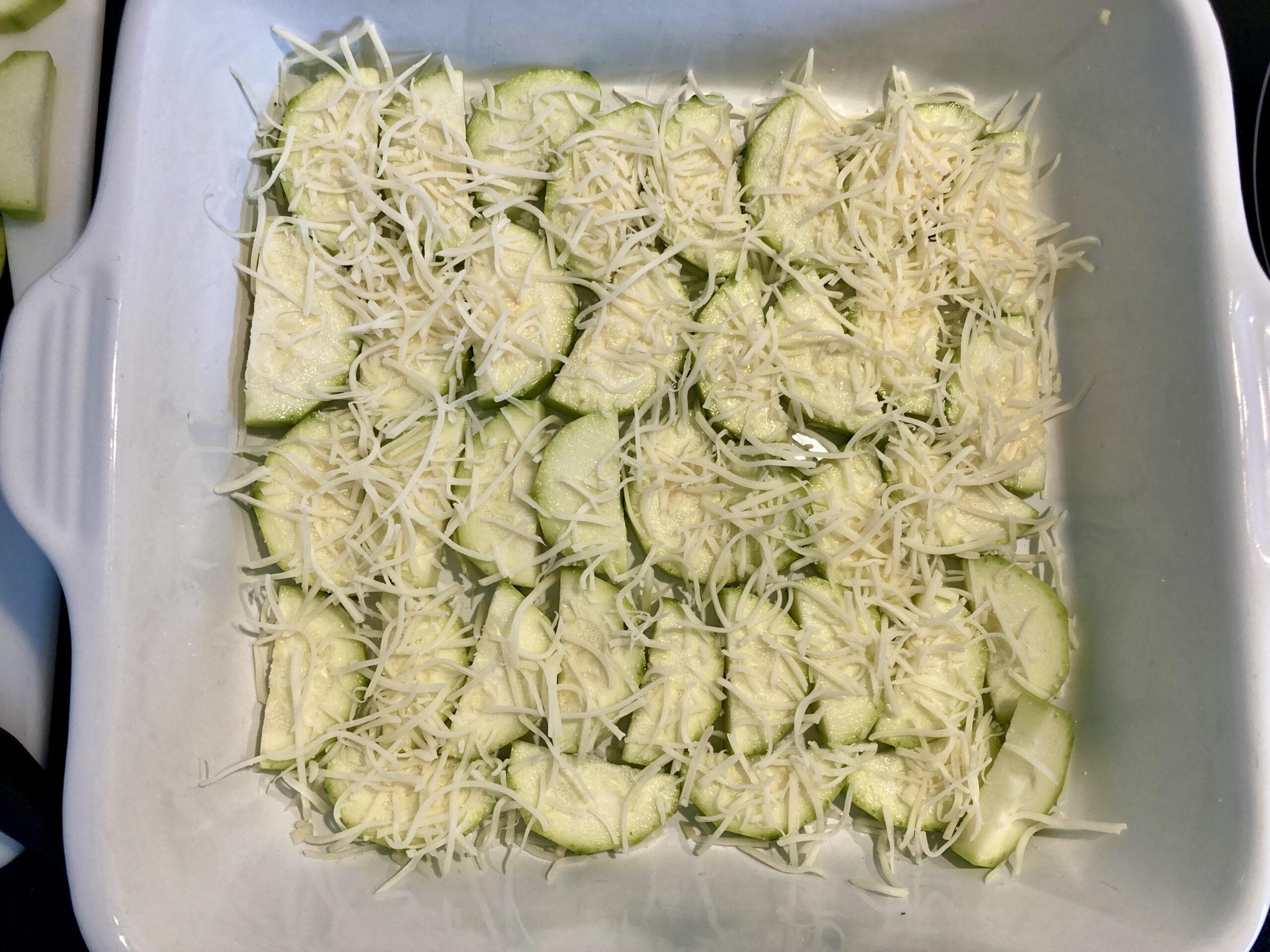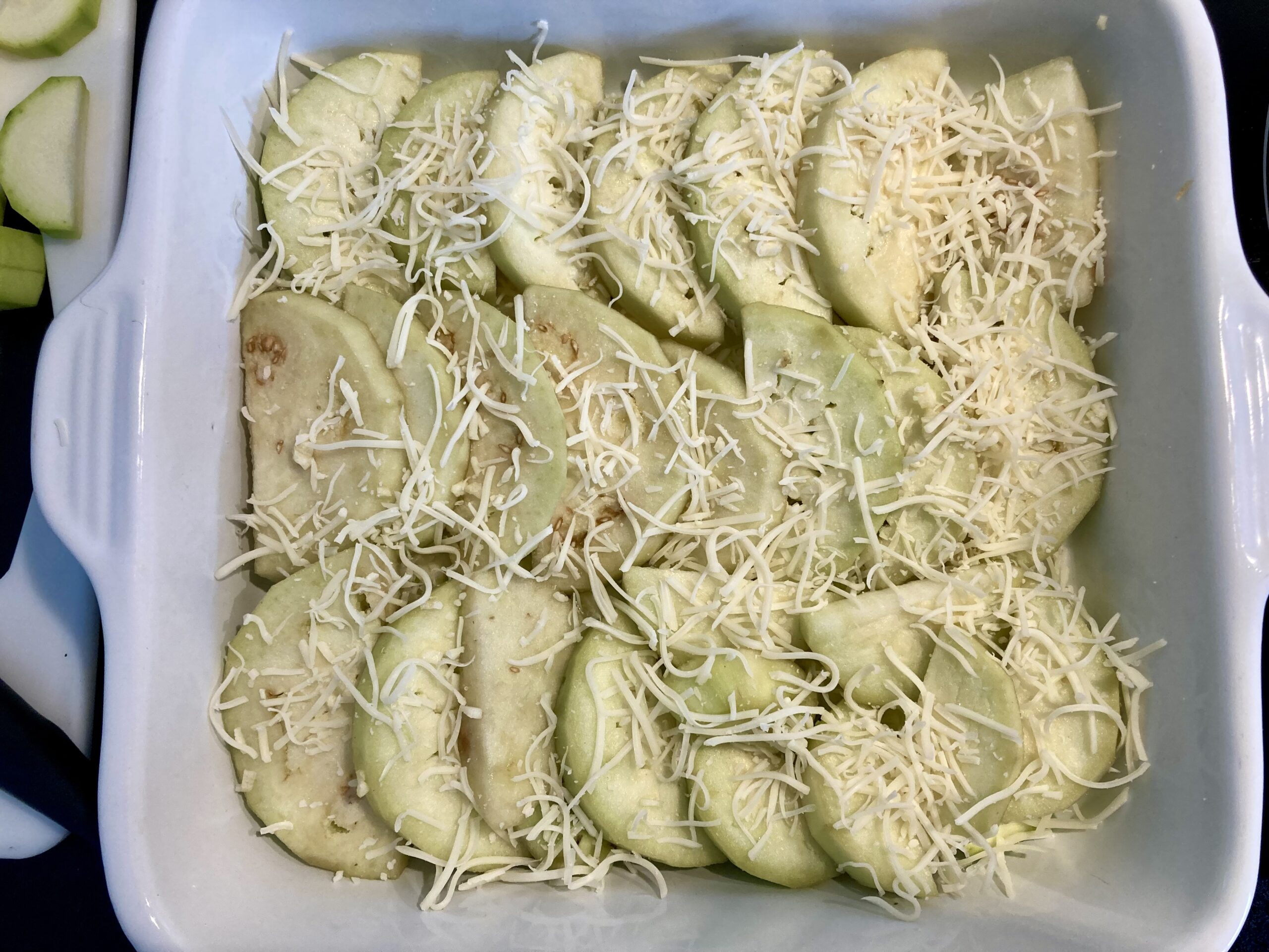 3. Dans un plat allant au four faire une première couche de courgettes. Salez. Saupoudrez avec un peu d’ail puis de gruyère râpé.