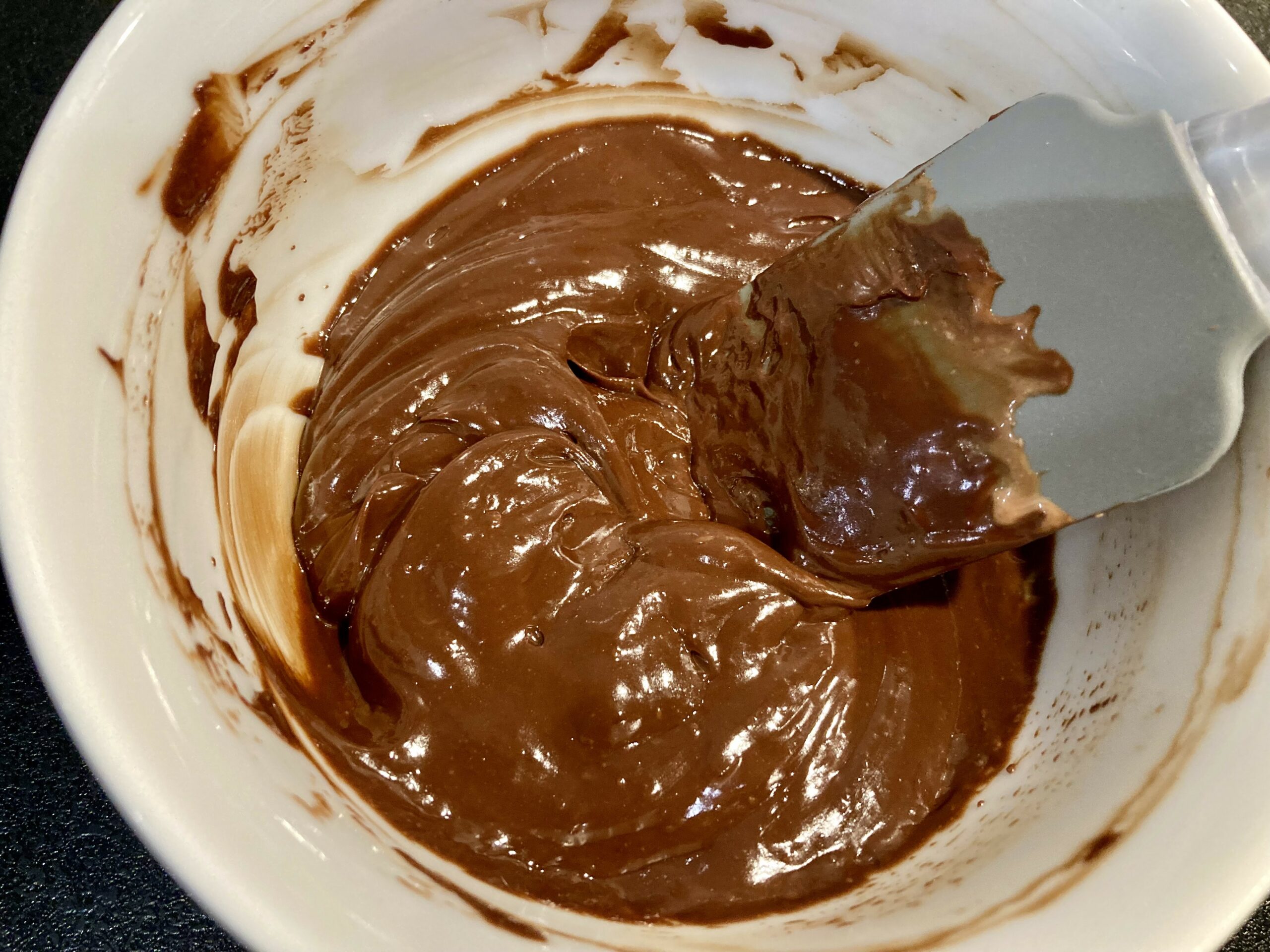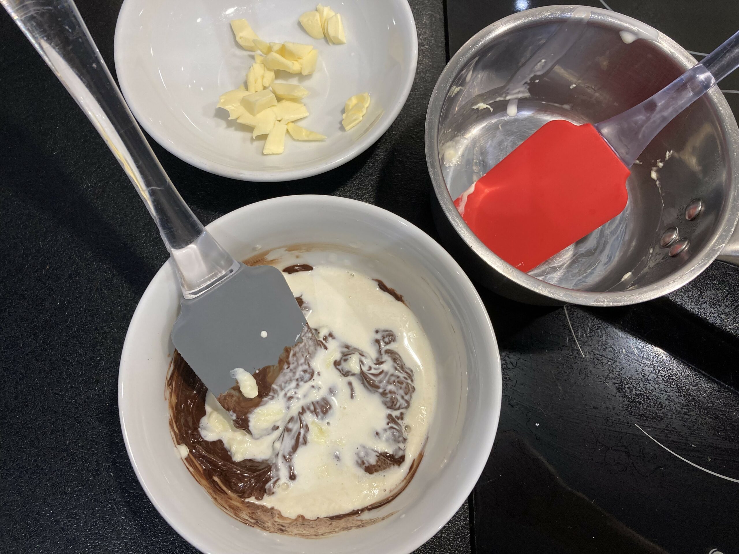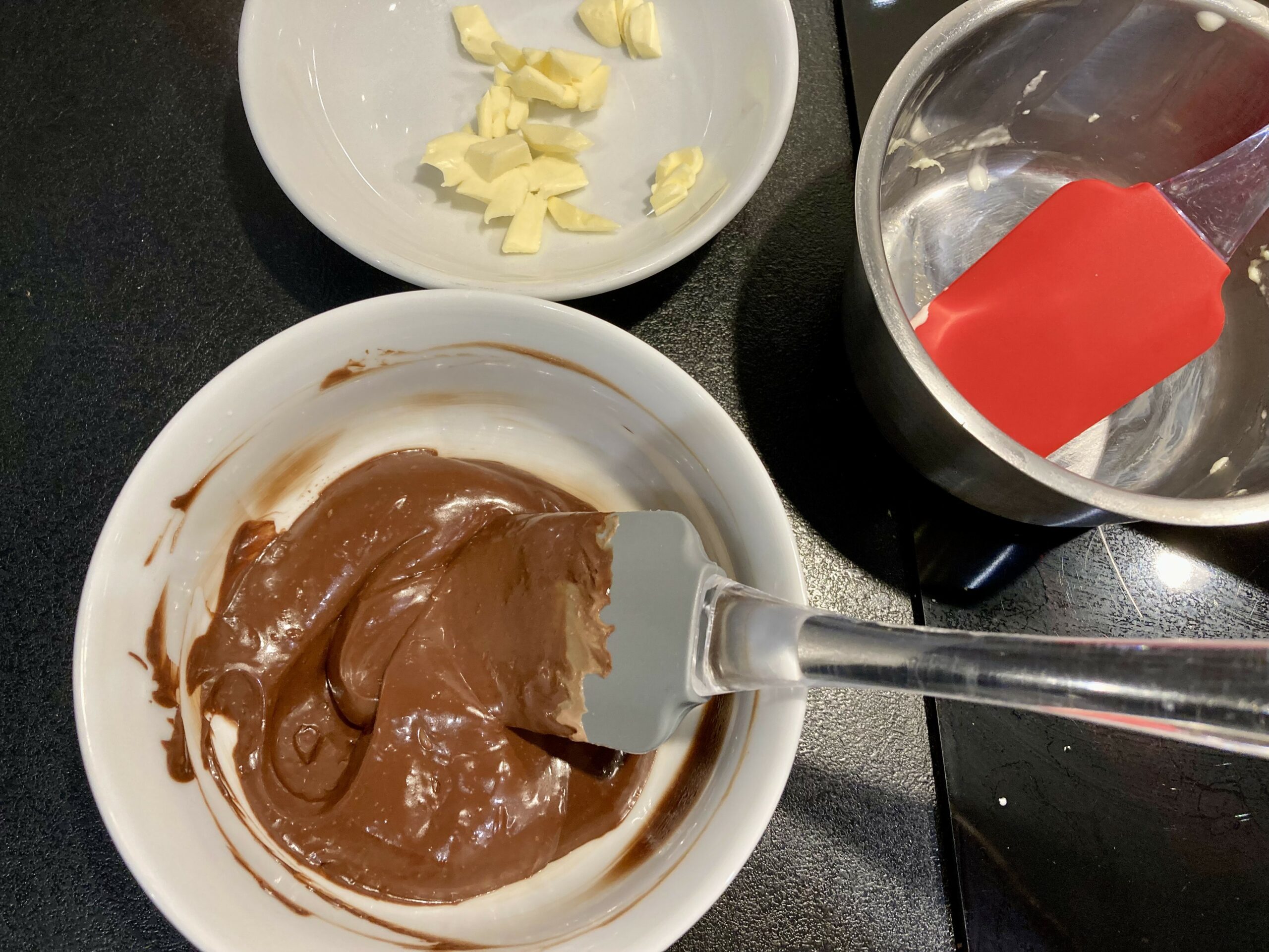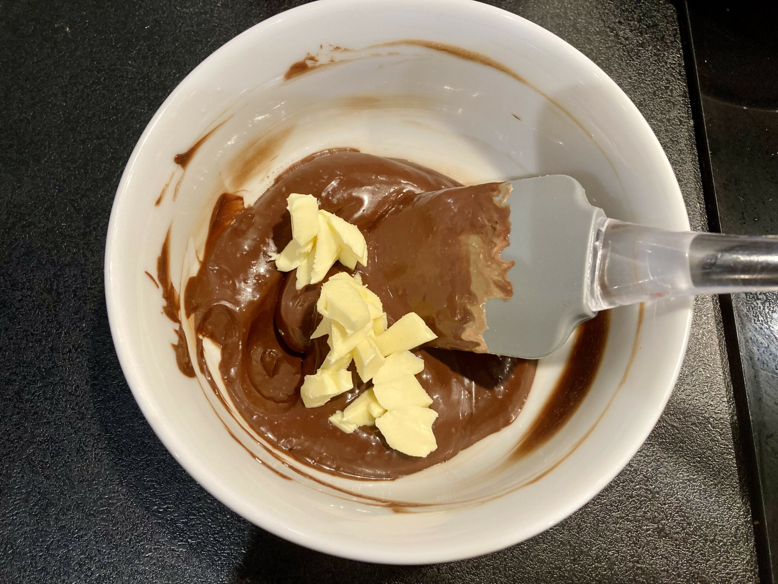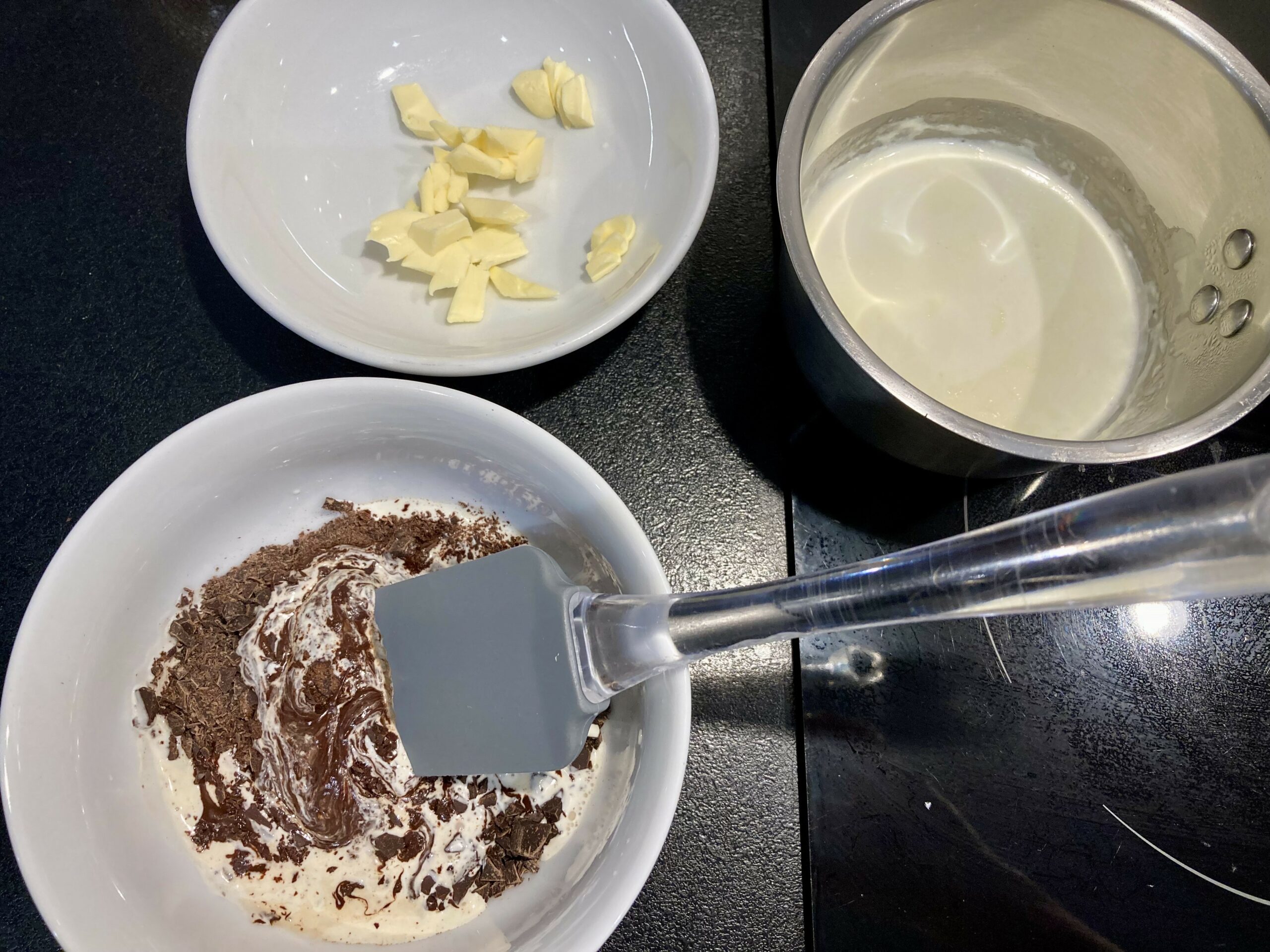 - Si quelques morceaux de chocolat ne sont pas totalement fondus, faites chauffer doucement la ganache au bain marie en remuant jusqu’à ce qu’elle soit lisse.