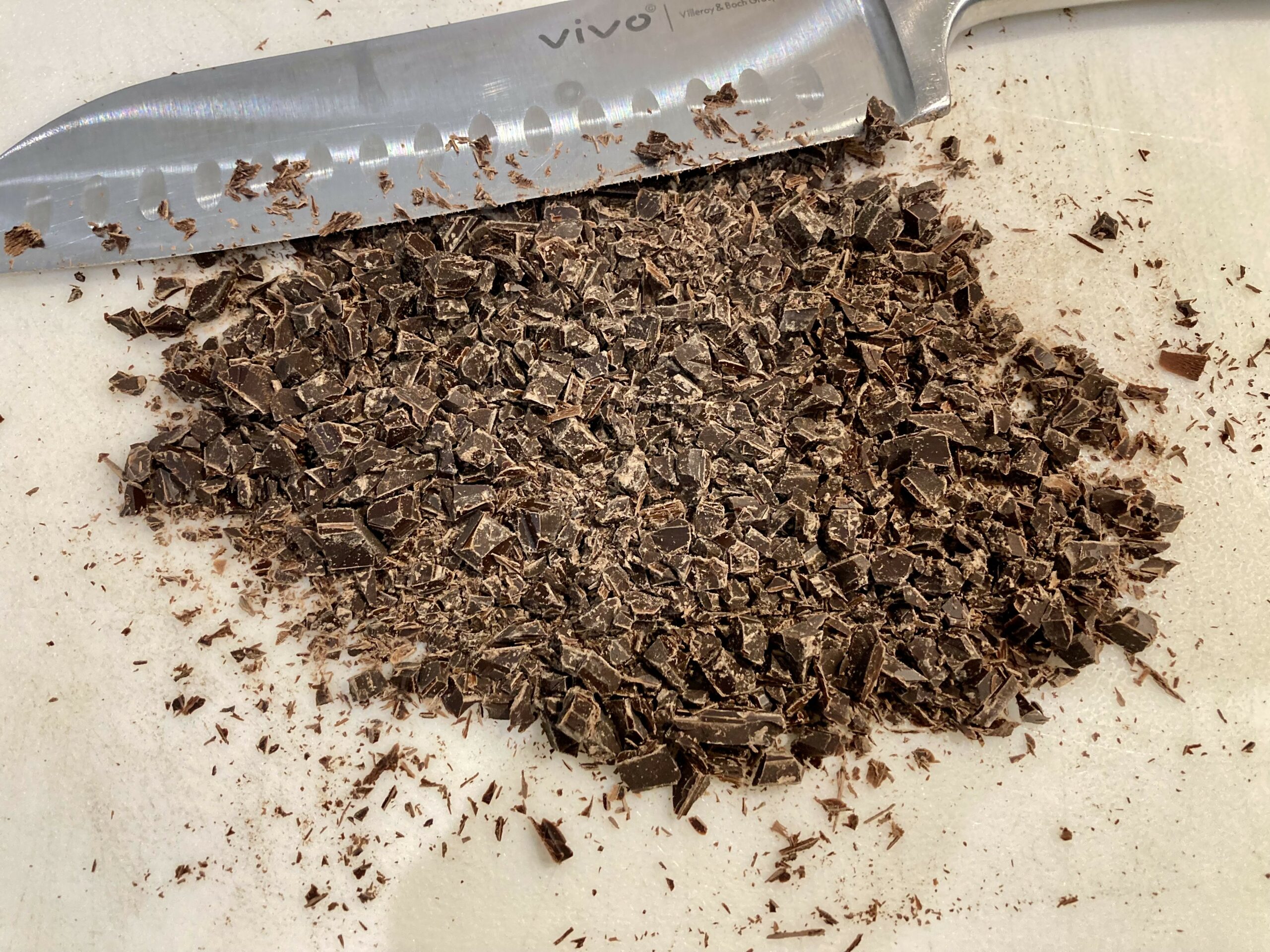 - Hachez le chocolat en petits morceaux (chocolat noir ou blanc) à l’aide d’un couteau.