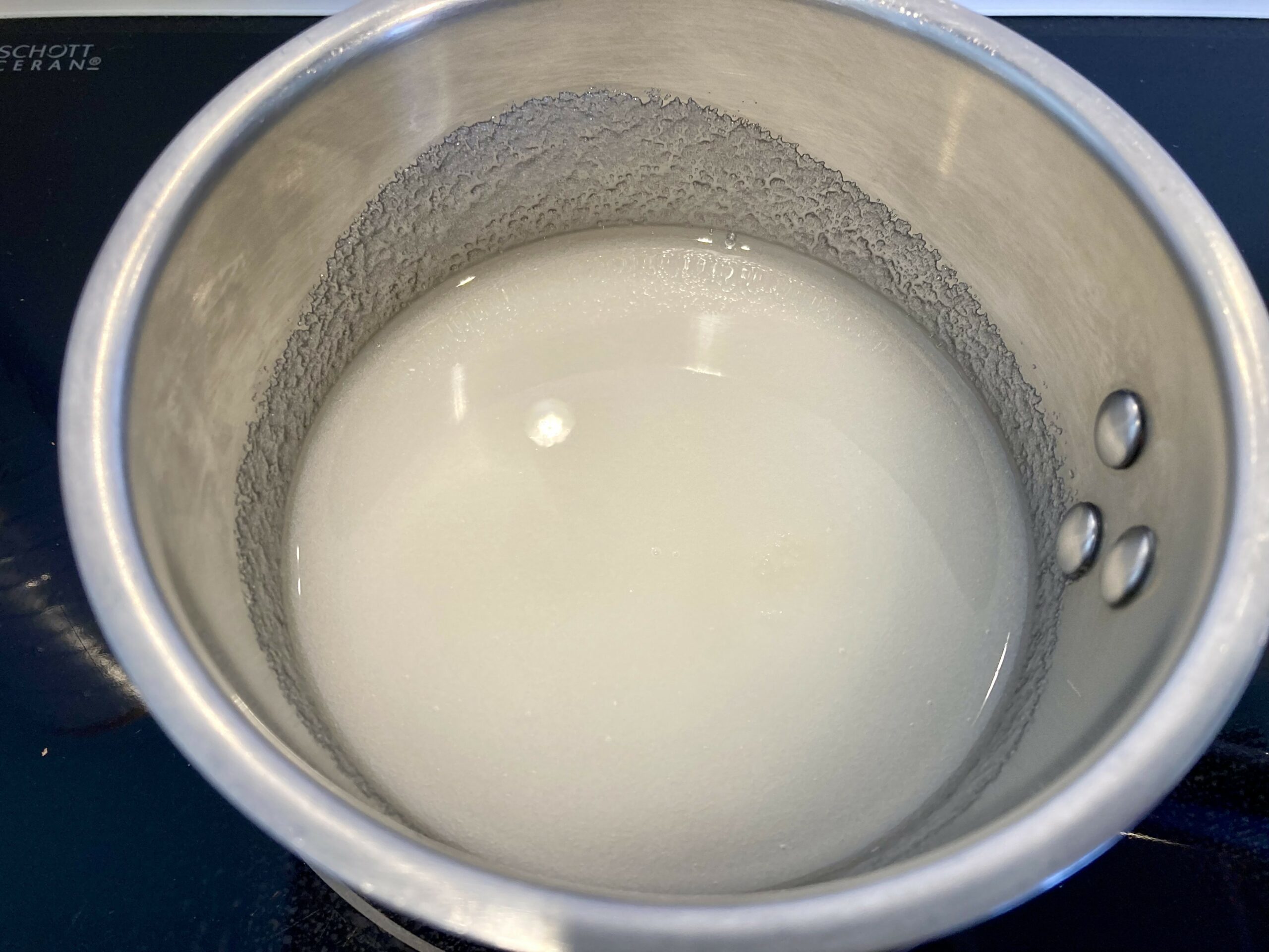 - Dans une casserole ajoutez la crème liquide à faire chauffer. Arrêter dés qu’elle commence à bouillir.