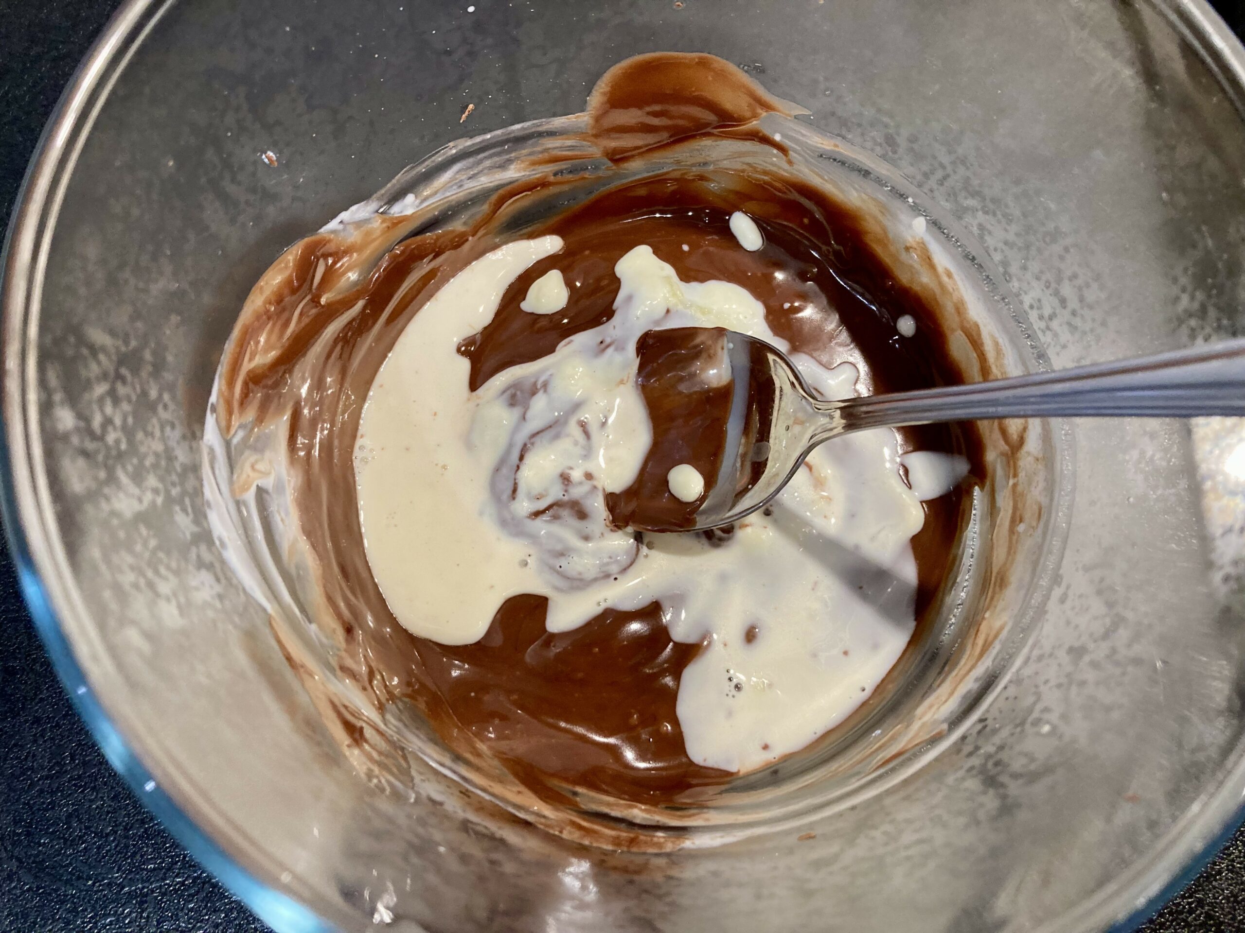 - Versez, selon les quantités, la crème liquide chaude sur le chocolat en une, deux ou trois fois. Après chaque ajout, attendre environ 30 secondes afin de laisser le chocolat ramollir, puis mélangez. Le mélange doit devenir lisse et homogène. Si quelques morceaux de chocolat ne sont pas totalement fondus, faites chauffer doucement la ganache au bain marie en remuant jusqu’à ce qu’elle soit lisse.