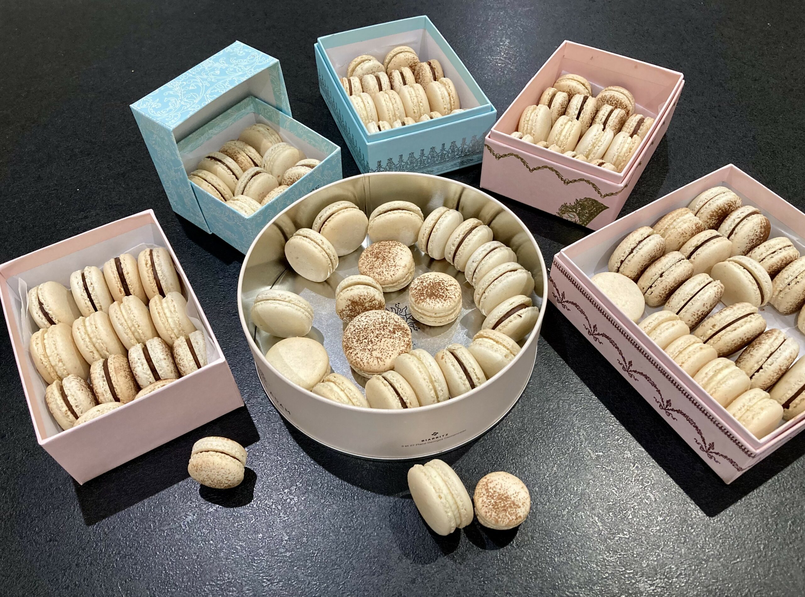 - ajoutez une petite quantité de colorant(s) en poudre (pointe de couteau) à la fin de l’étape 3 dans le tant pour tant (poudre d’amande + sucre glace) tamisé avant d’ajouter les blancs d’oeufs.
