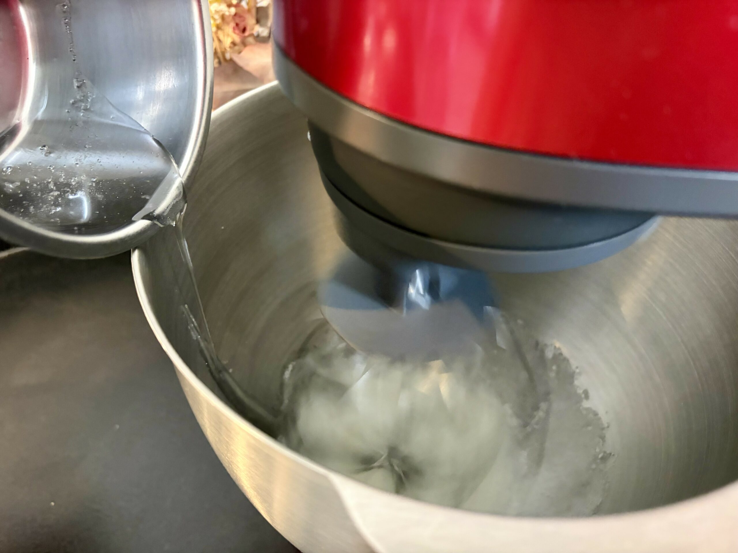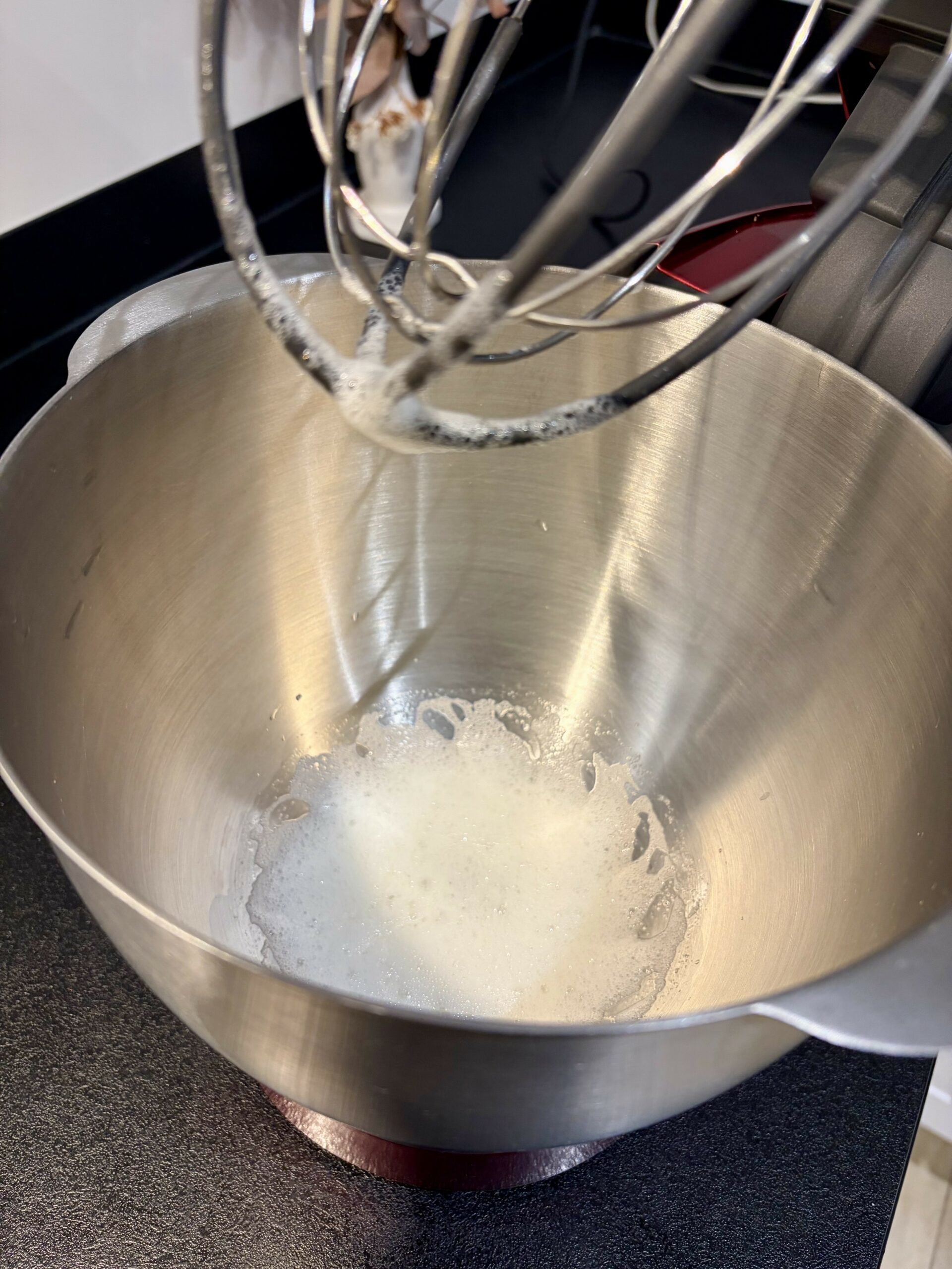 - Dès que les blancs sont mousseux, blancs et encore fluides, tout en continuant à fouetter (petite vitesse) versez en filet le sirop à 118°C progressivement le long de la paroi de la cuve.