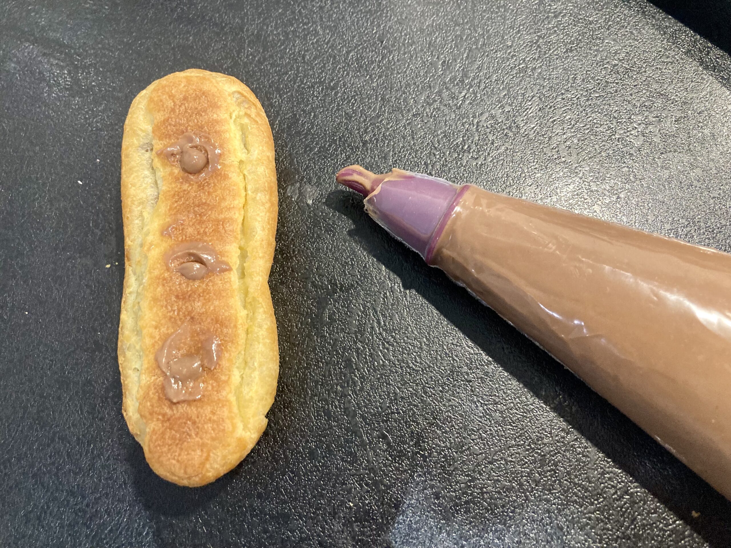 • Pour remplir les éclairs, l’utilisation d’une poche à douille ou d’une seringue de pâtisserie est préférable. Si vous n’en avez pas il faut couper les éclairs en deux et ajouter à la cuillère la crème pâtissière au chocolat.
