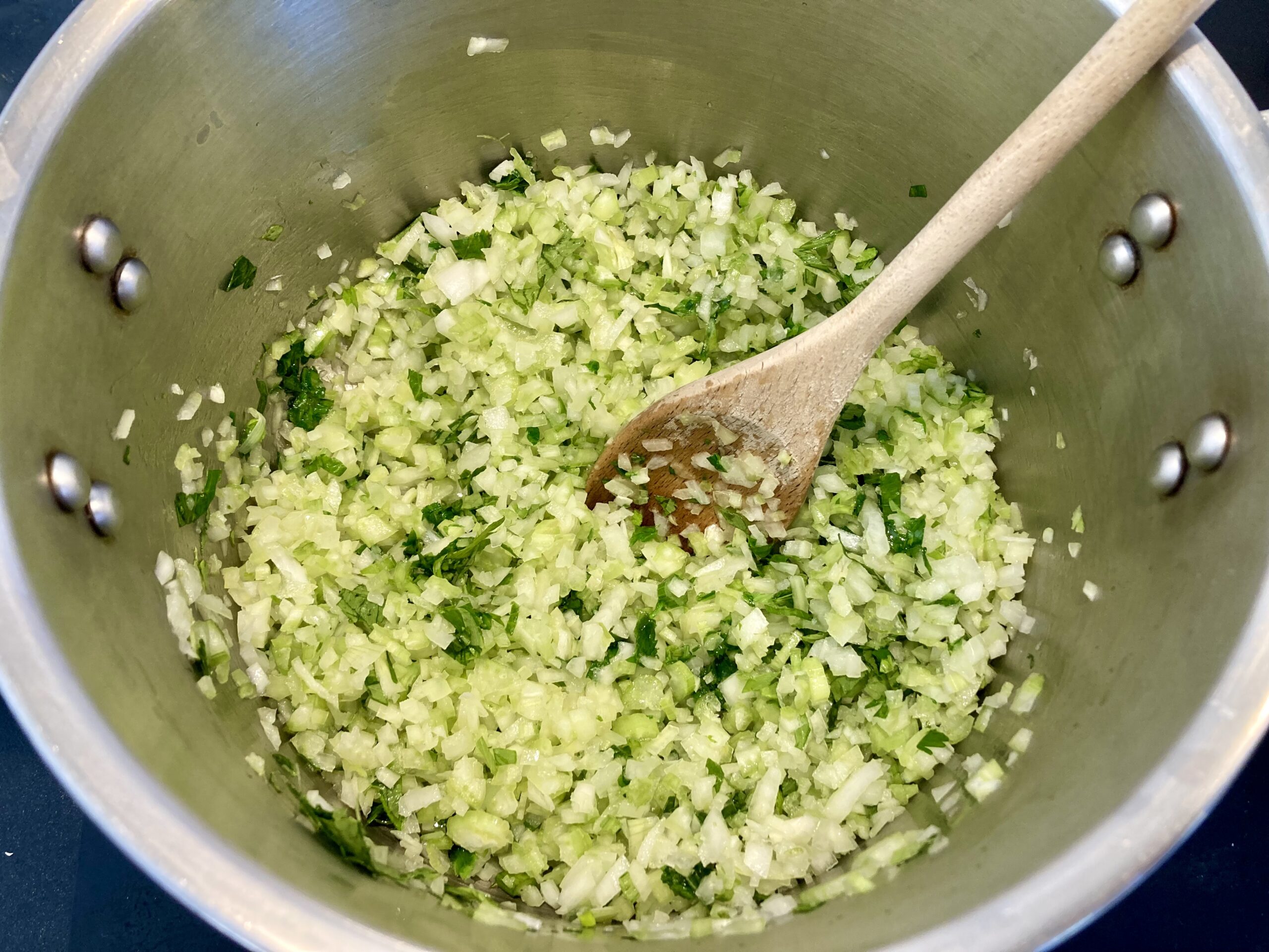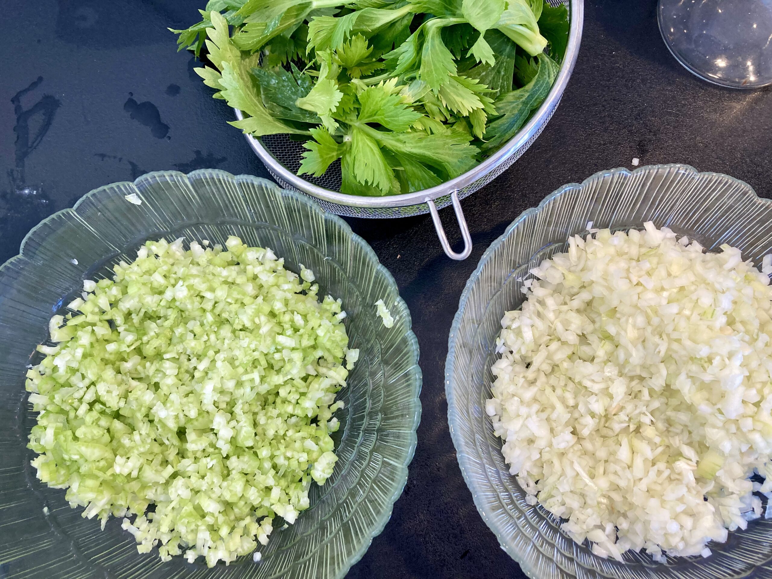 1.Hachez avec un couteau l’oignon (ne pas utiliser de mixeur). Séparez les branches et les feuilles de céleri puis hachez-les au couteau (ne pas utiliser de mixeur).
