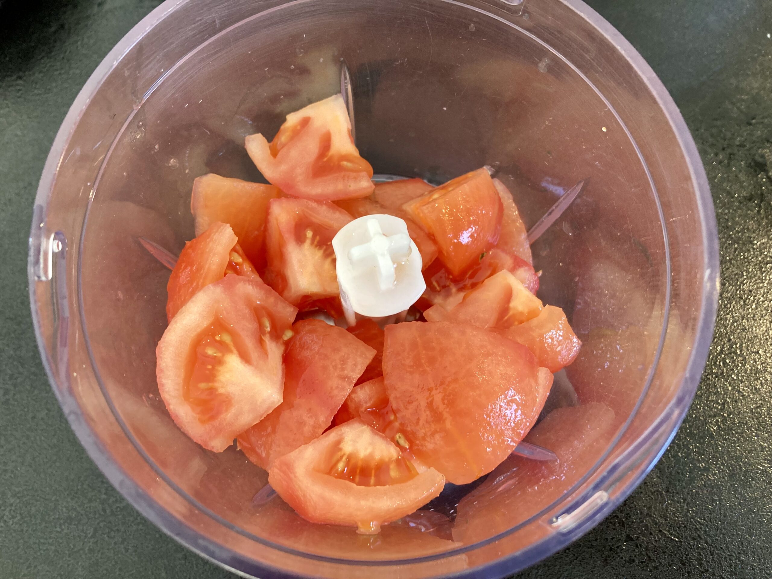 4.Pendant ce temps, mixez (ou hachez finement au couteau) les tomates et hachez le persil et la coriandre.