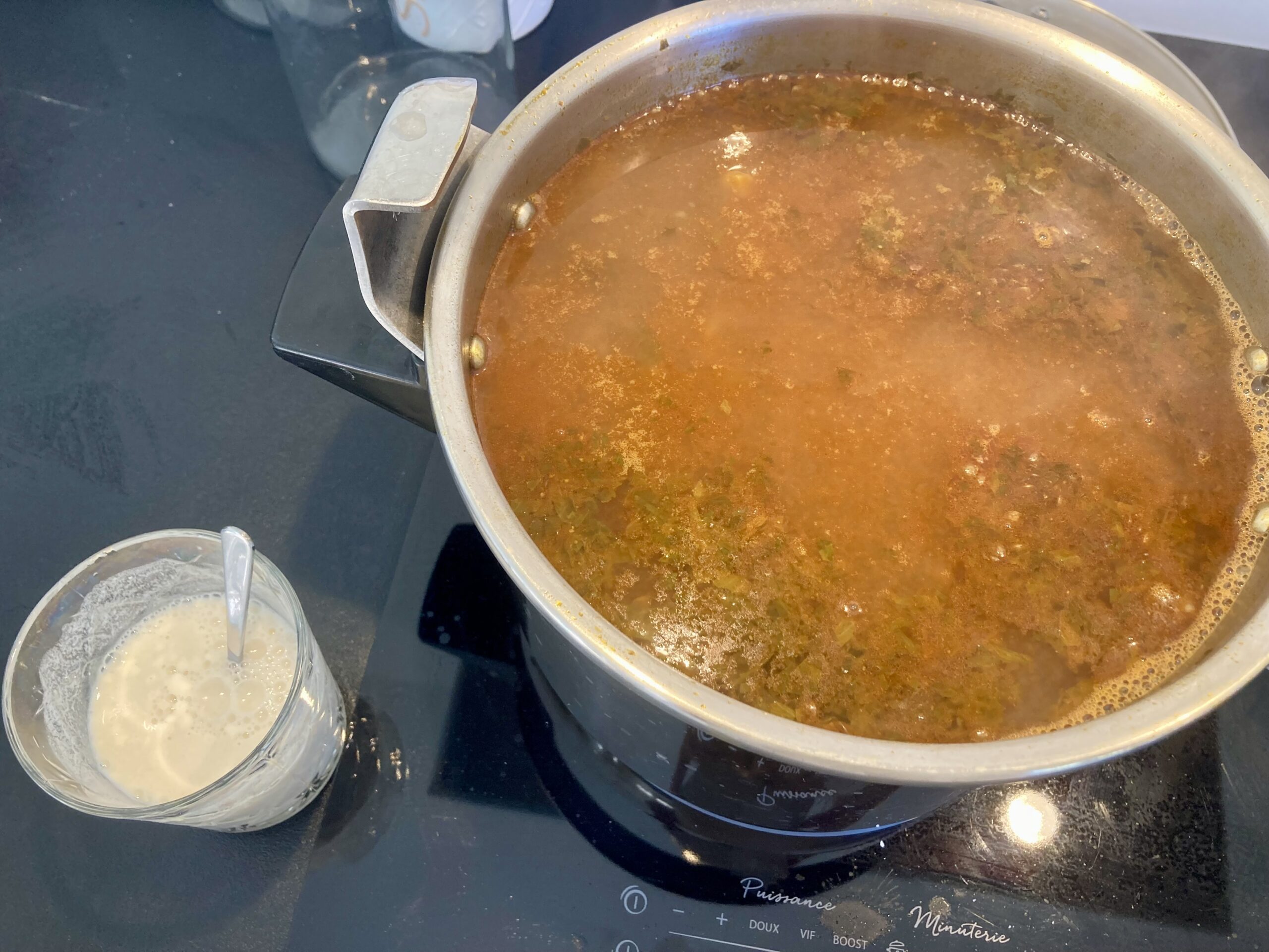 9.Mélangez la farine dans un demi verre d’eau froide. Ajoutez, mélangez et laissez cuire 10 minutes. Rectifiez l’assaisonnement en fonction de vos goûts.