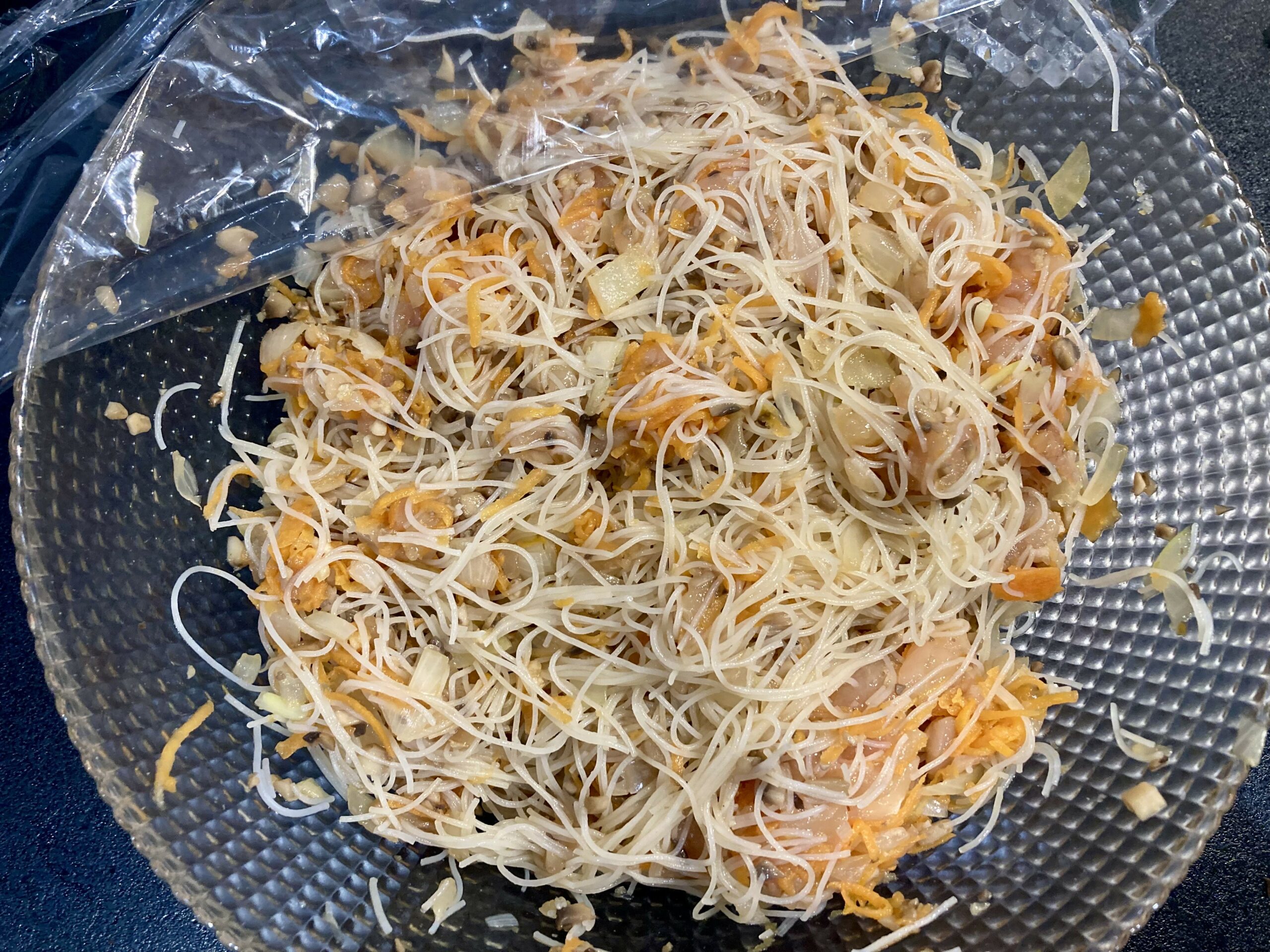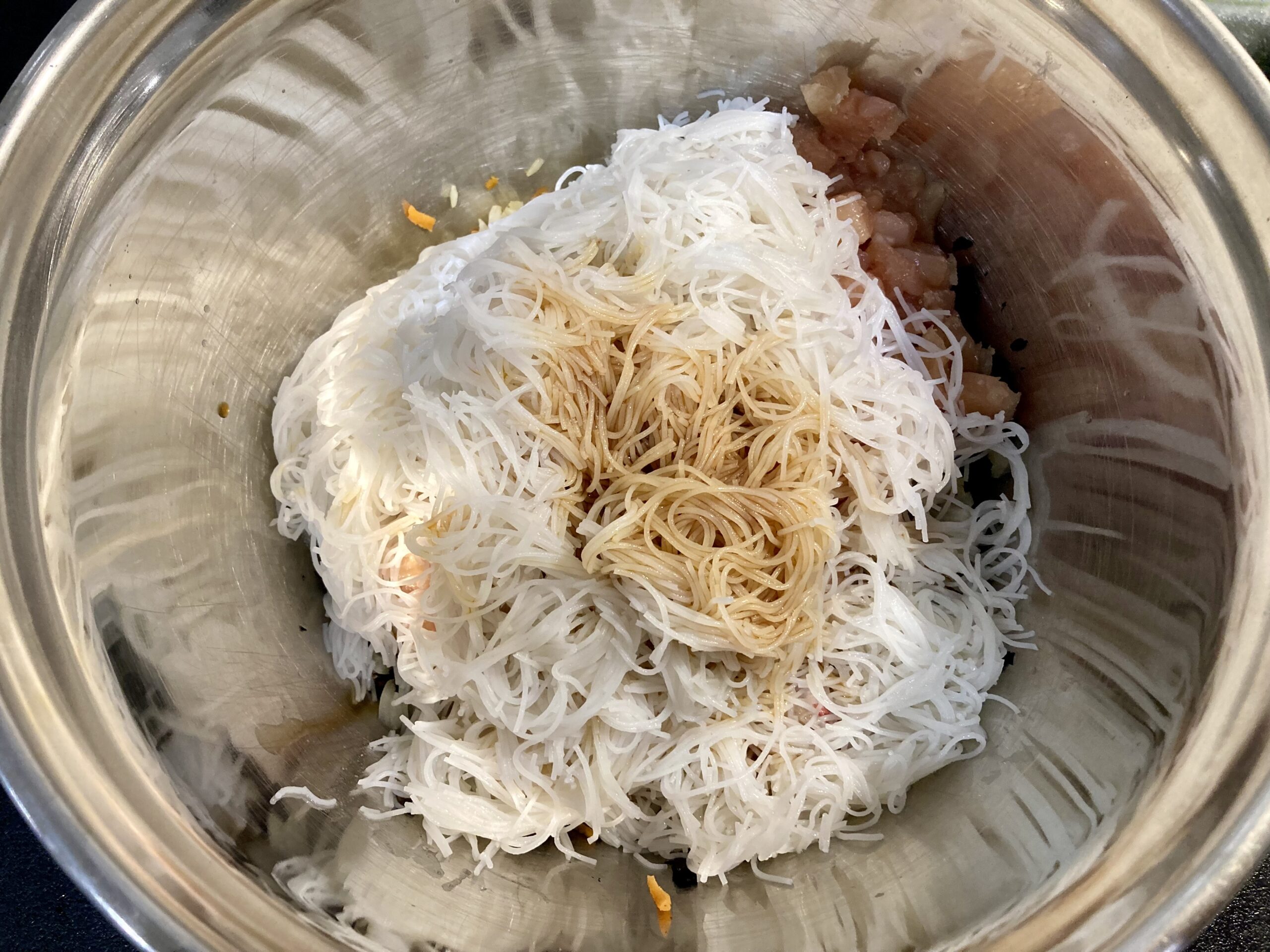 - Placez les vermicelles de riz dans un récipient. Faites bouillir de l’eau. Ajoutez-la sur les vermicelles. Laissez-les dans l’eau 5 minutes. Rincez les vermicelles à l’eau froide. Egouttez-les bien.