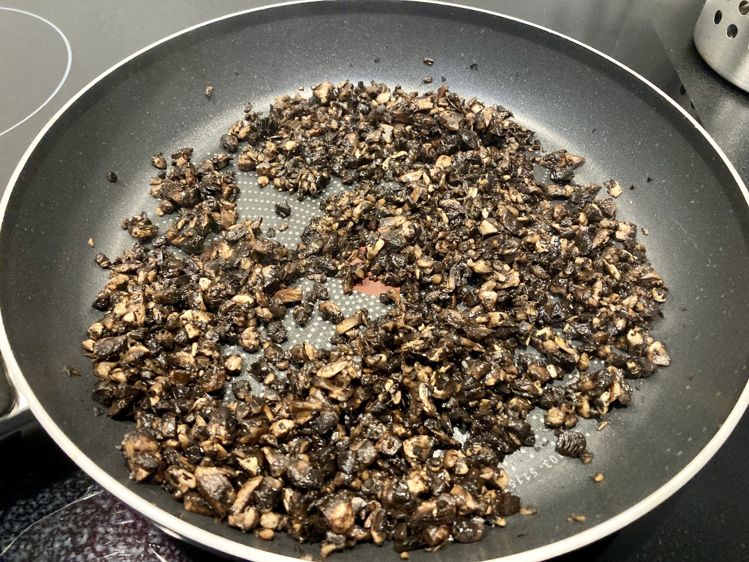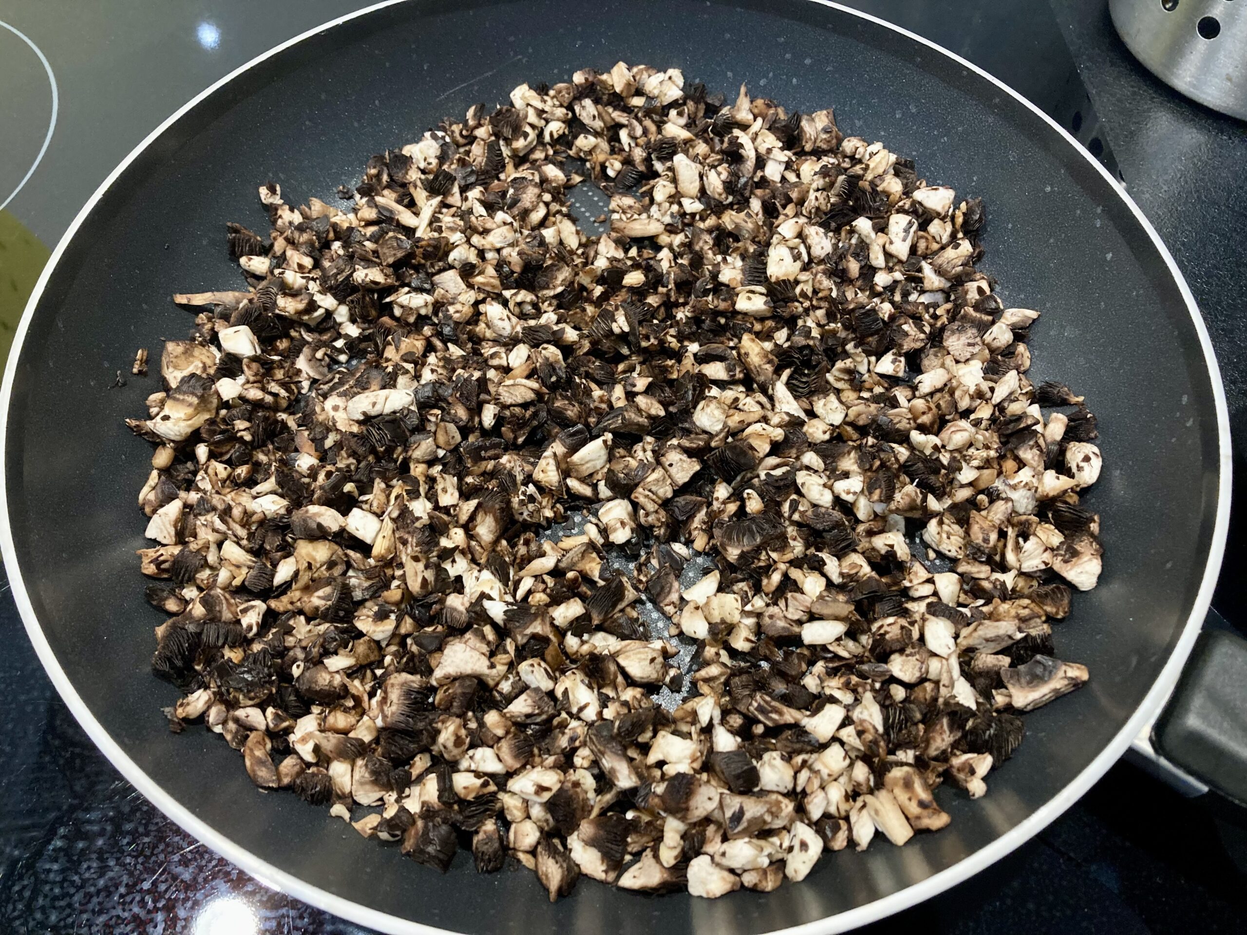 - Cuisez les dés de champignons 5 à 10 minutes jusqu’à ce qu’ils perdent leur eau. Mettez-les de côté dans un récipient.