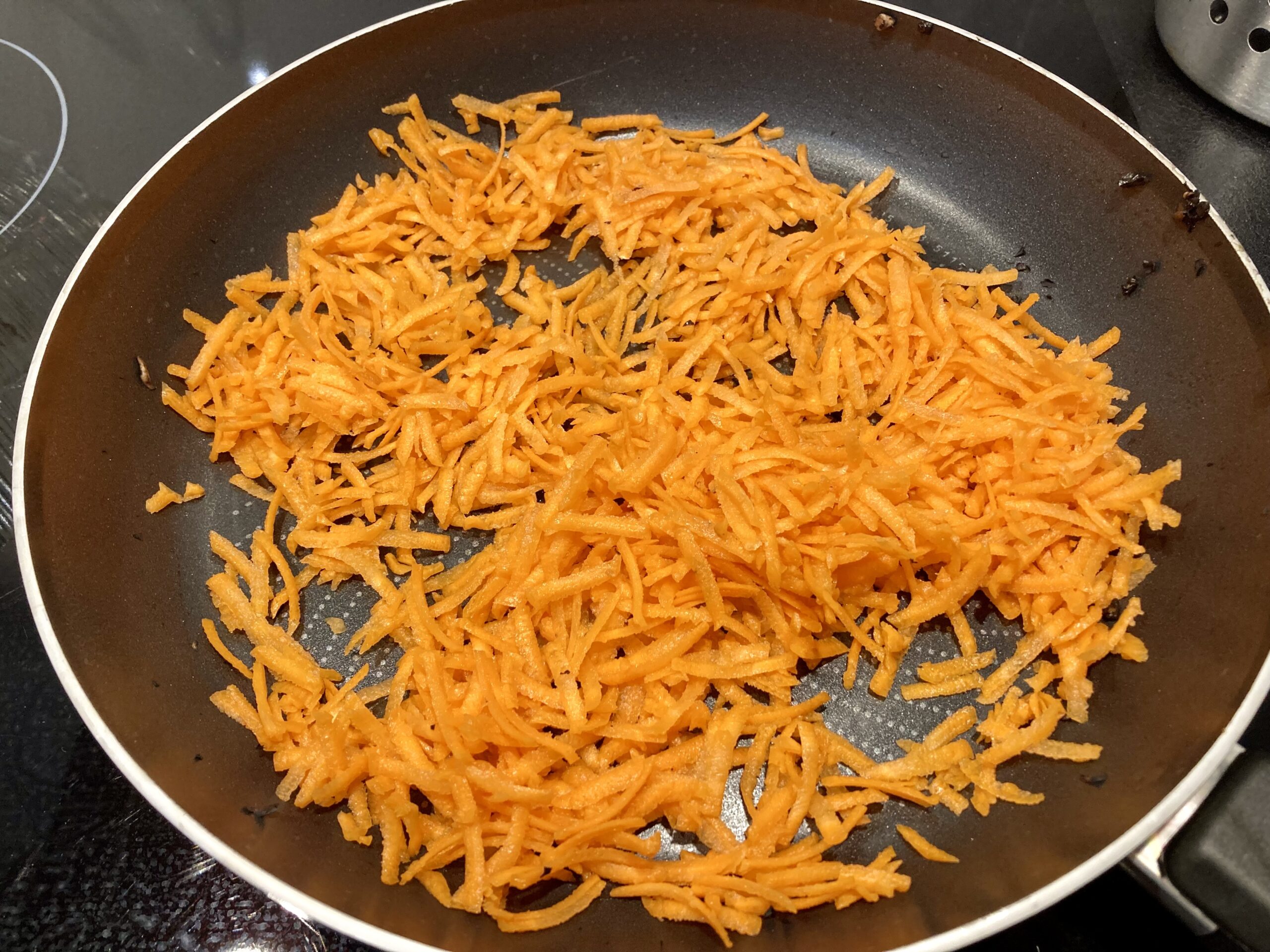 - Cuisez les carottes râpées et laissez cuire environ 5 minutes. Ajoutez-les aux champignons.