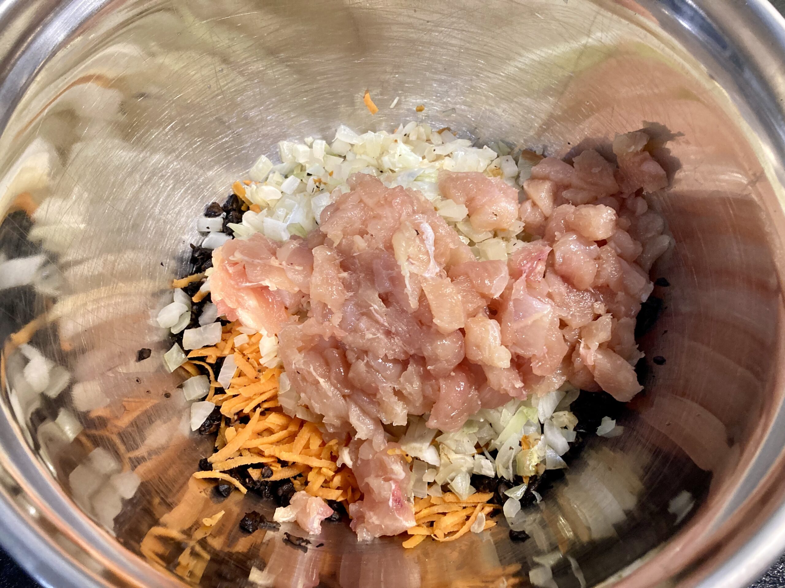 2. Dans une poêle SANS HUILE (le but et d’éliminer le maximum d’humidité pour éviter que les nems éclatent à la cuisson):