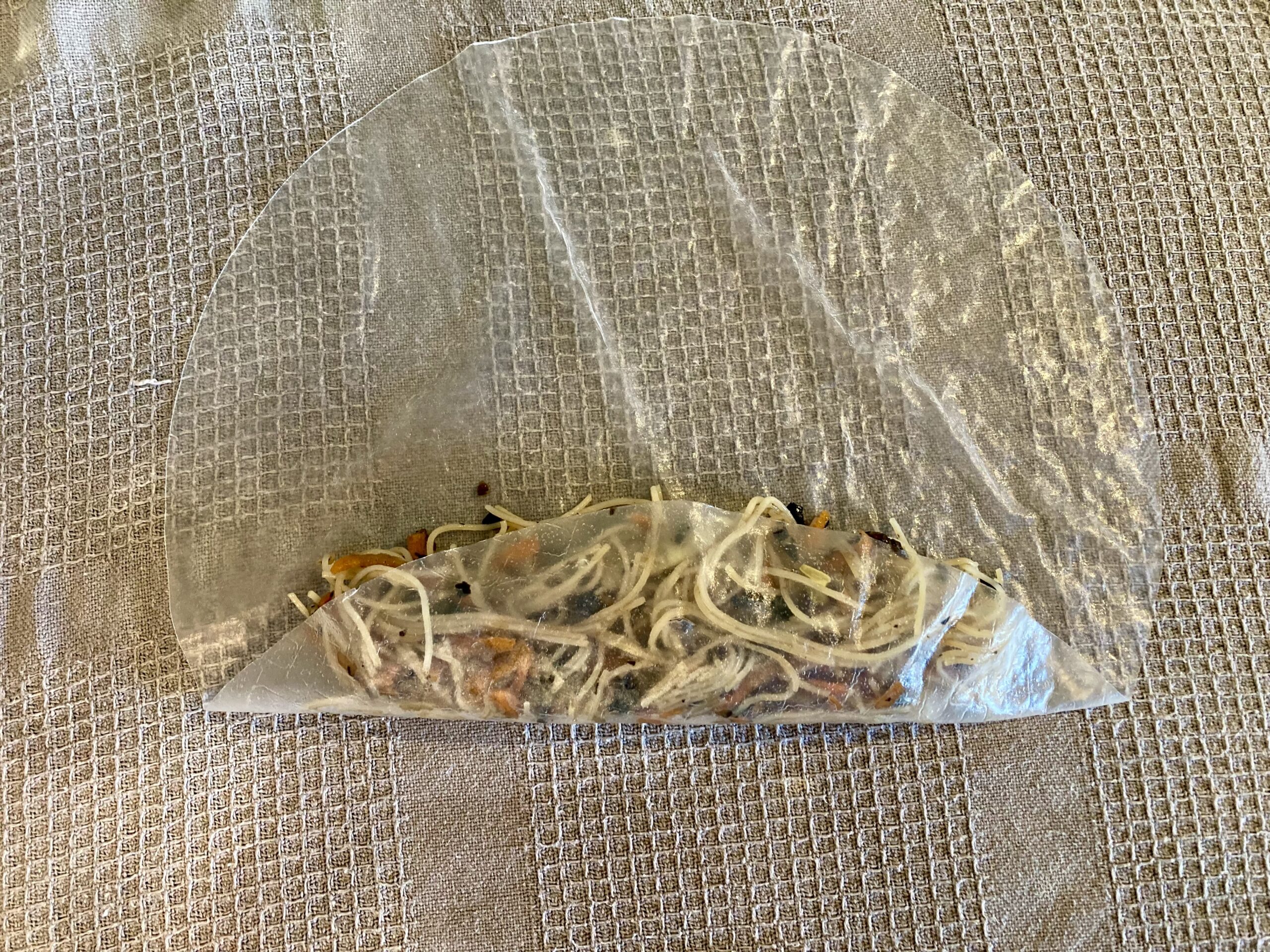 - Placez-la sur le torchon humide (côté lisse sur le torchon et coté rugueux vers vous). La galette de riz va finir de ramollir en 20 à 30 secondes.