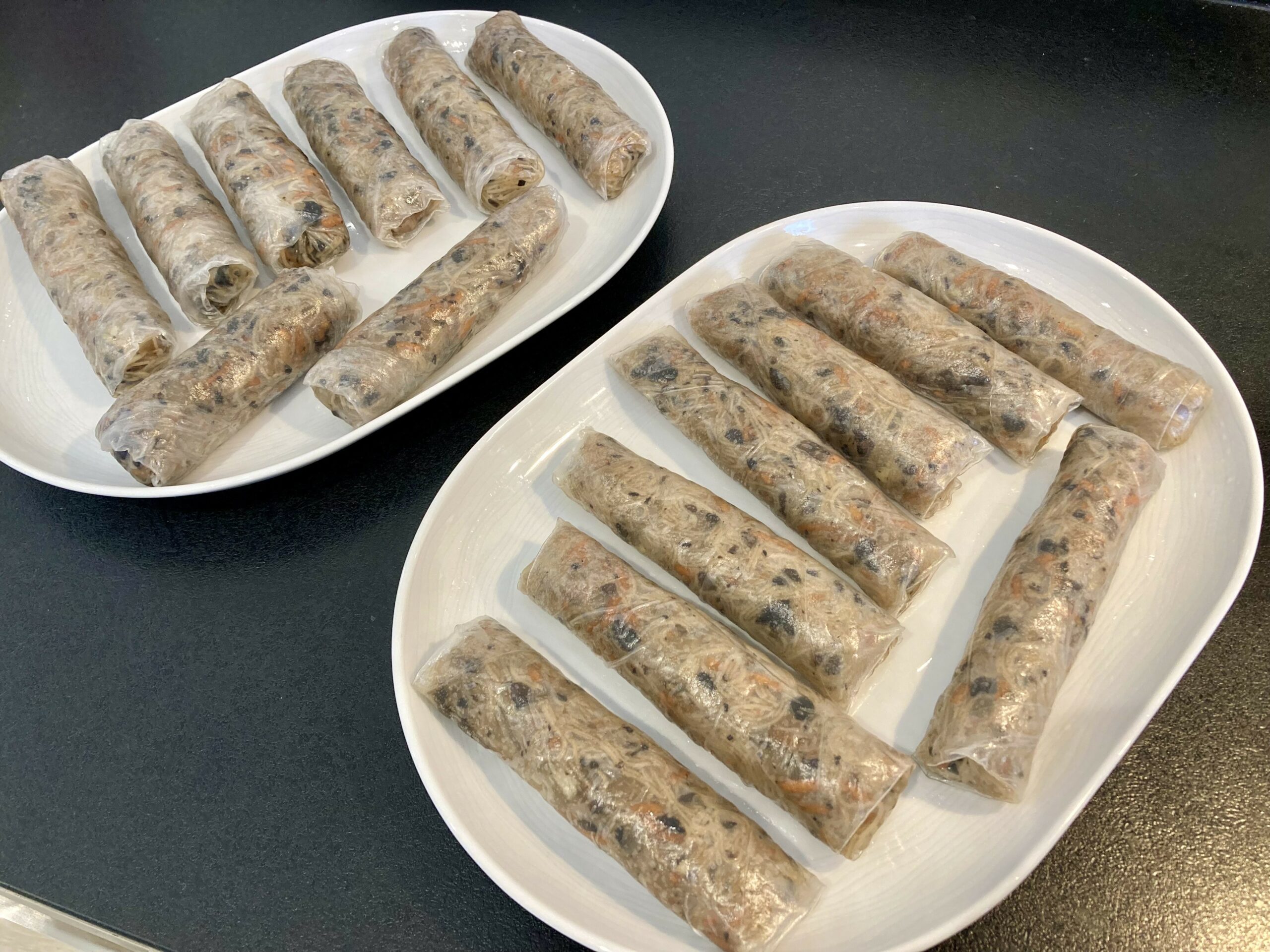 - Posez les nems sur un plat légèrement huilé pour éviter qu’ils collent et laissez les sécher 30 minutes avant de les frire (leur surface devient légèrement collante et frit beaucoup mieux).
