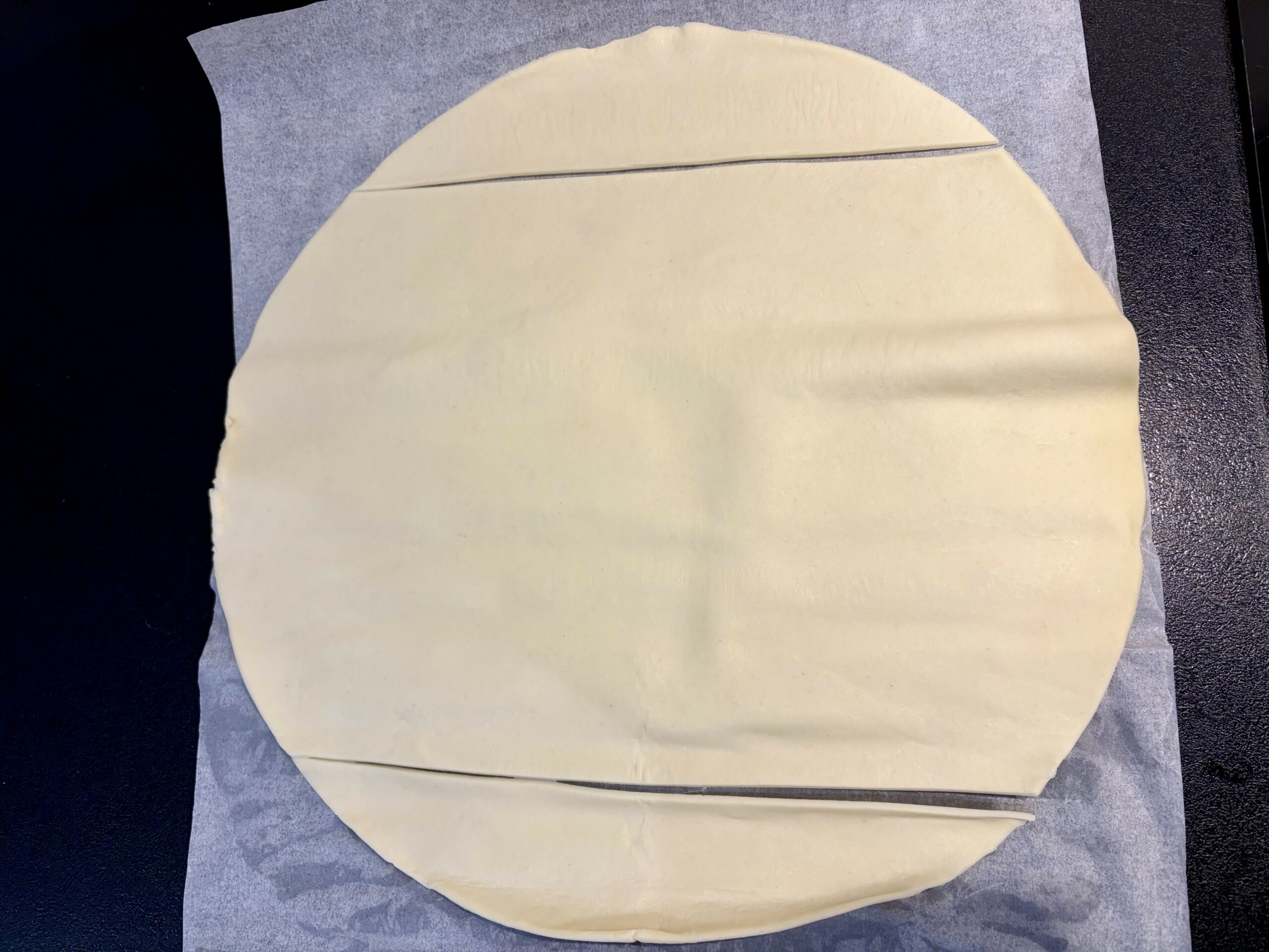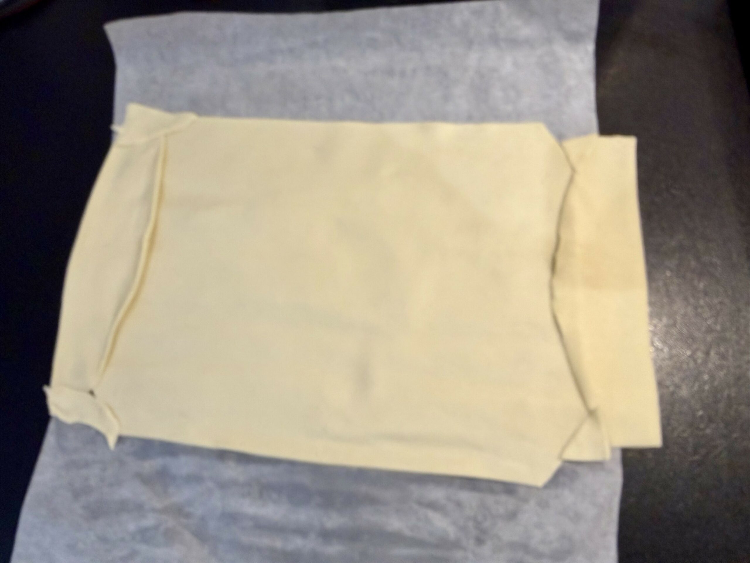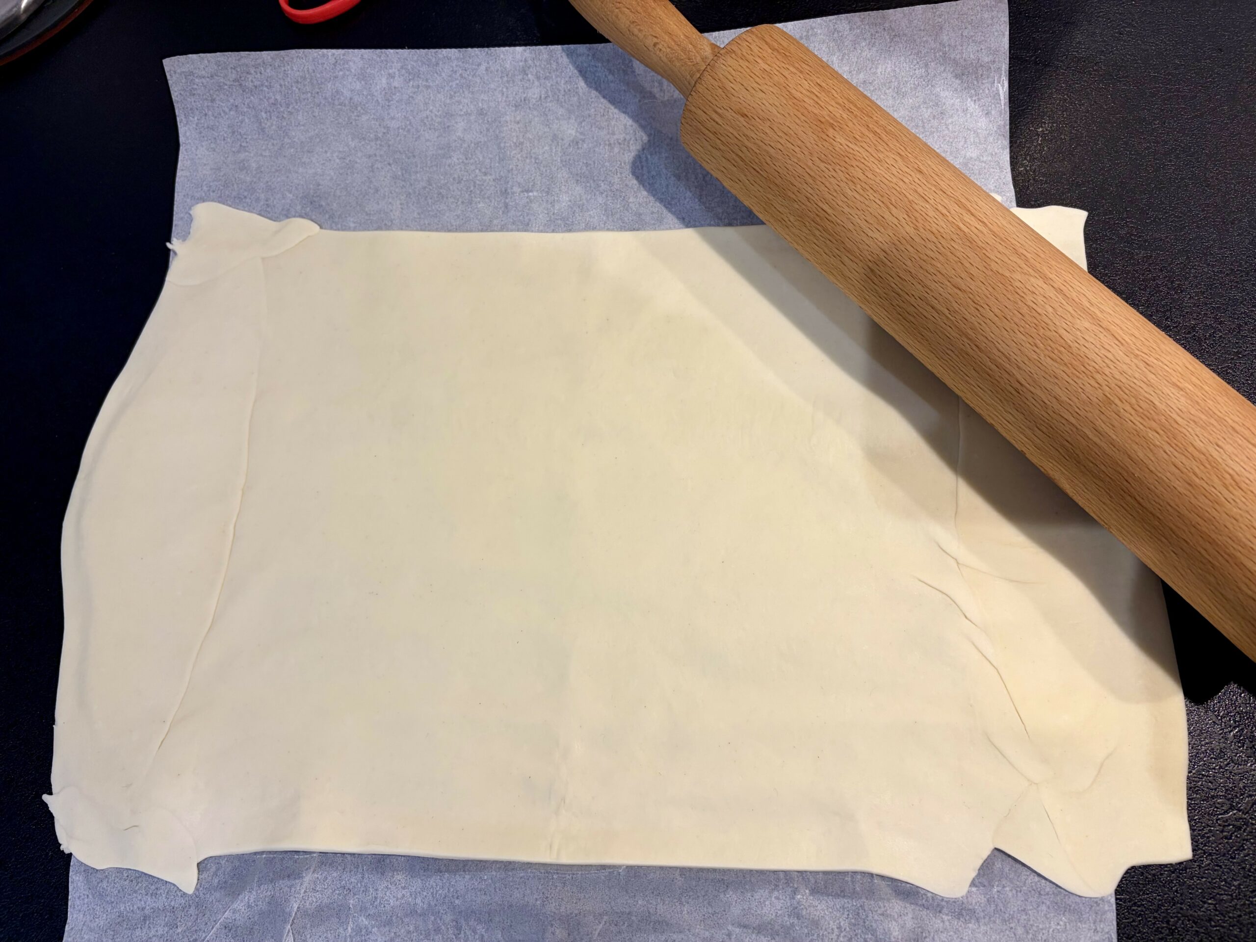 1. Déroulez la pâte feuilletée. Si elle est ronde, coupez 2 bandes en haut et en bas et repositionnez-les sur les côtés arrondis. Passez un léger coup de rouleau à pâtisserie pour souder et obtenir une pâte quasi rectangulaire.