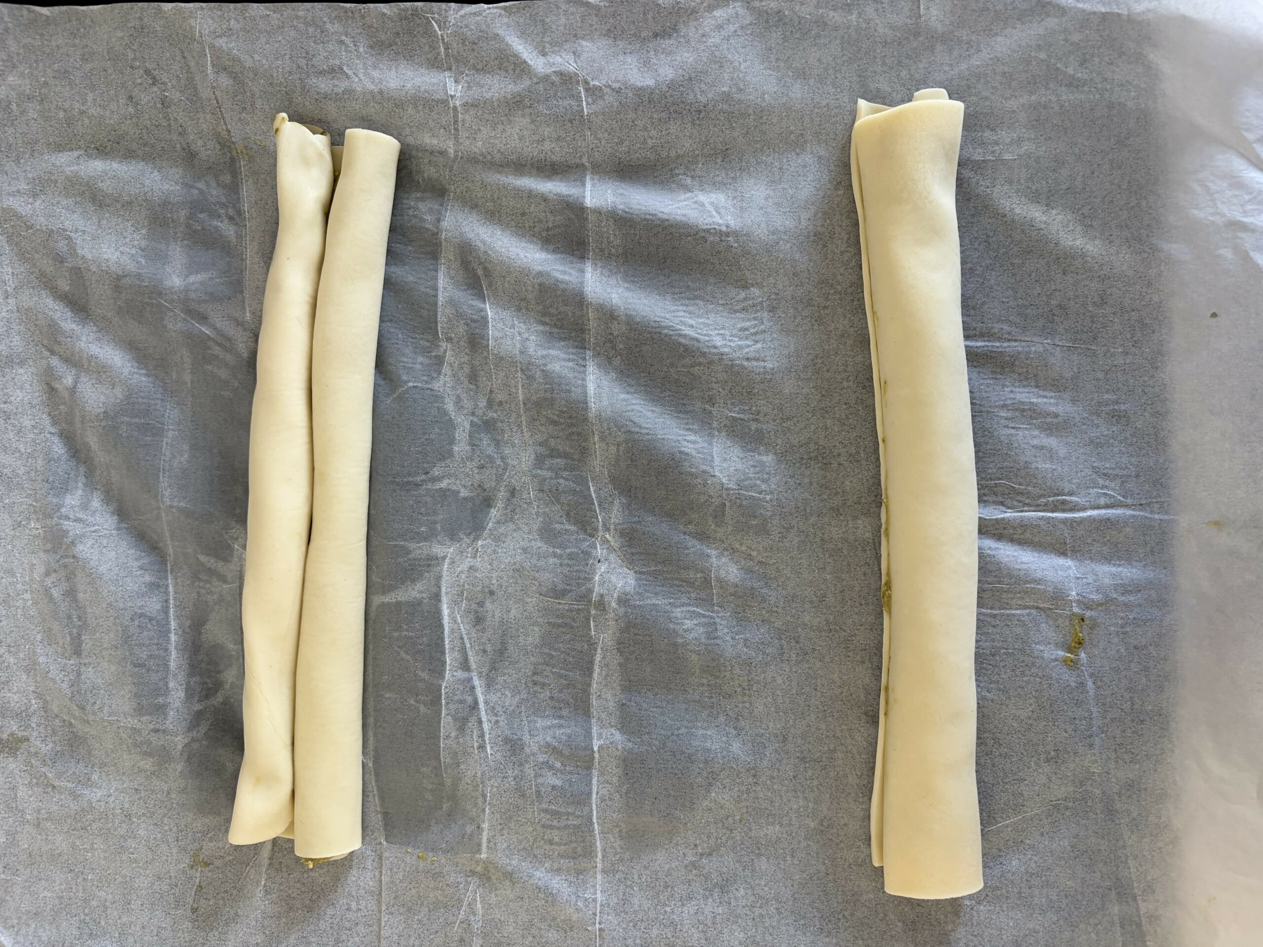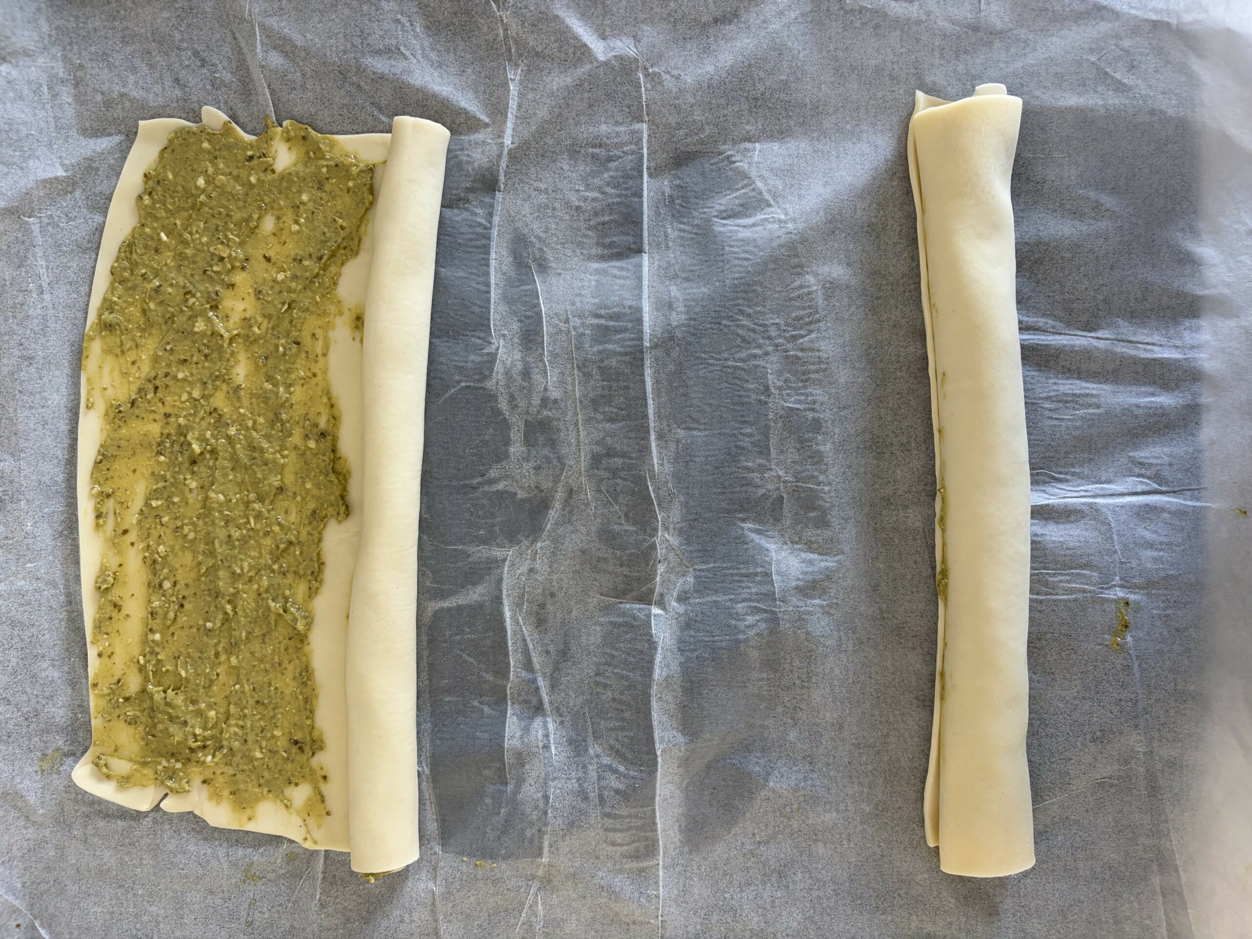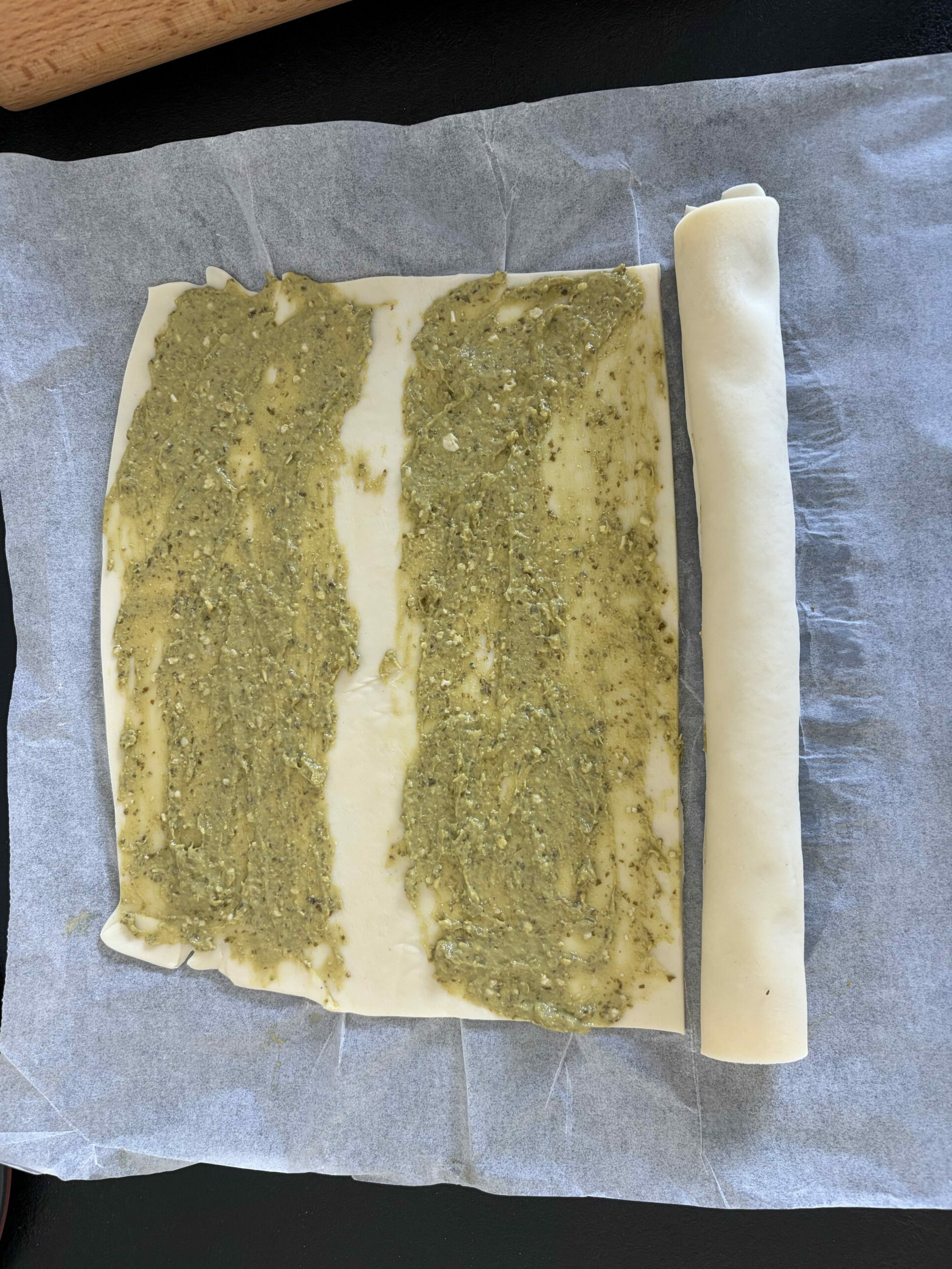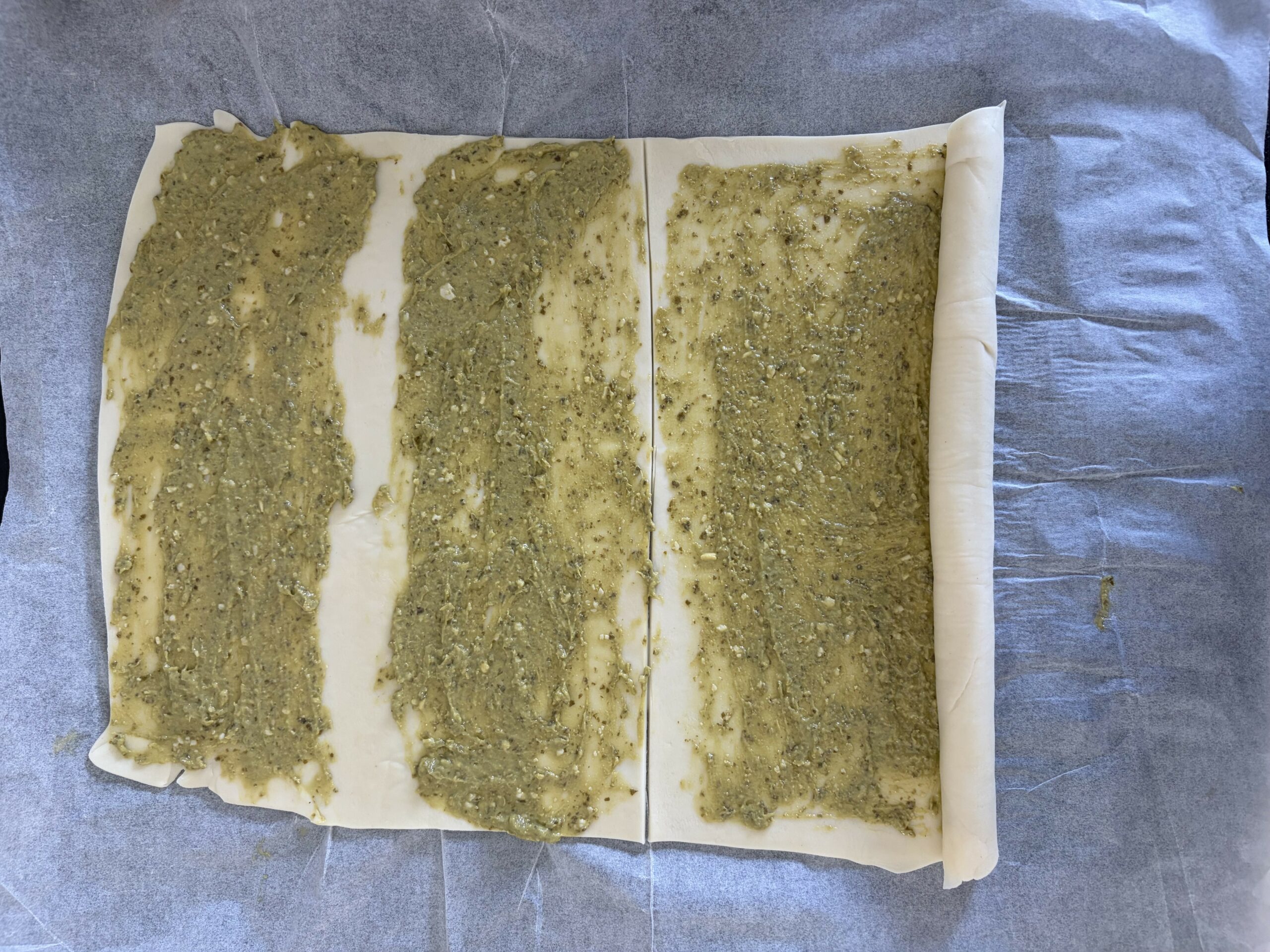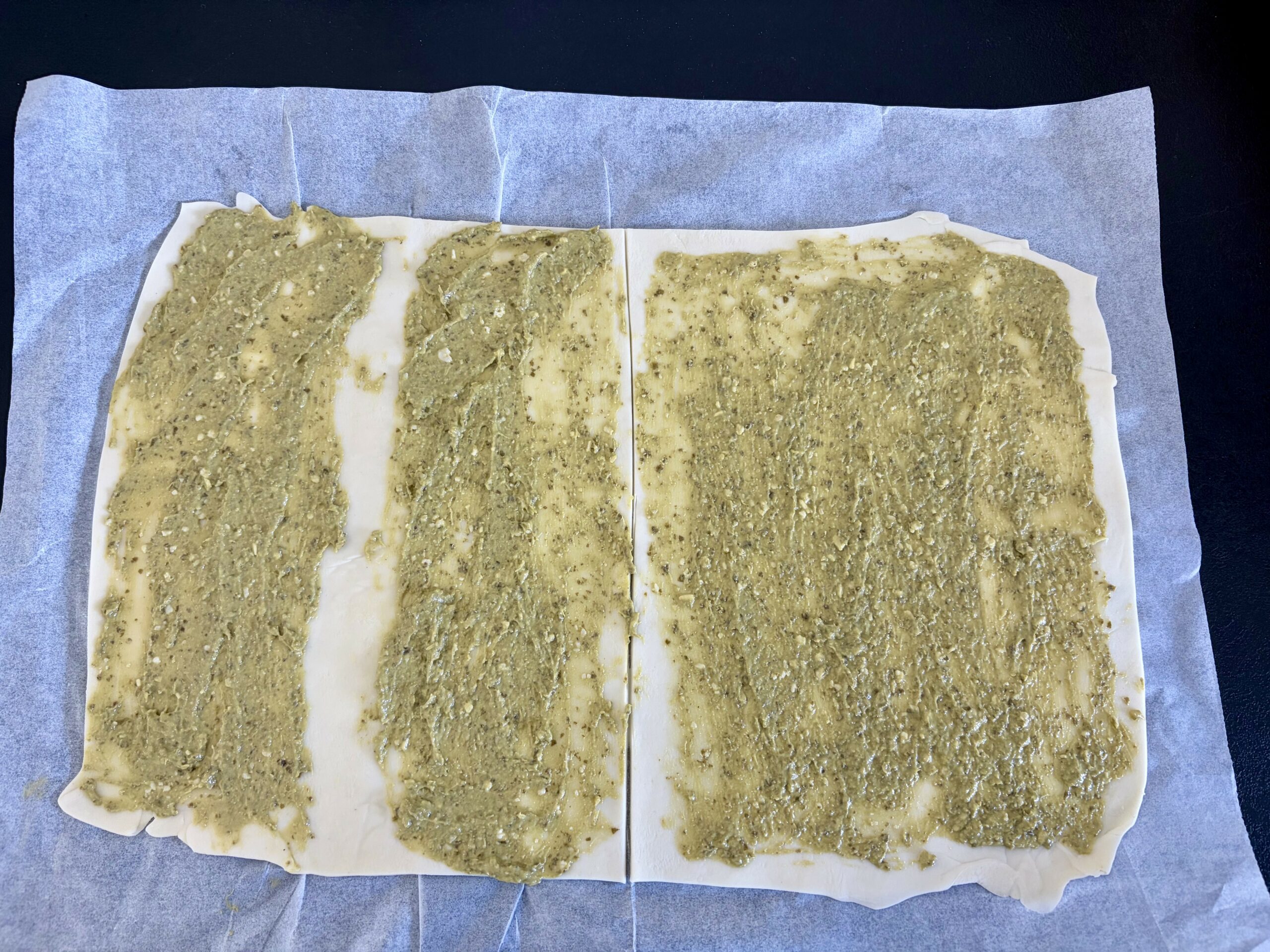 2. Etalez une fine couche de votre garniture (j’ai utilisé une garniture mixée à base de pesto, ricotta et pignons). Ne mettez pas trop de garniture sinon cela va empêcher le feuilletage de se développer.