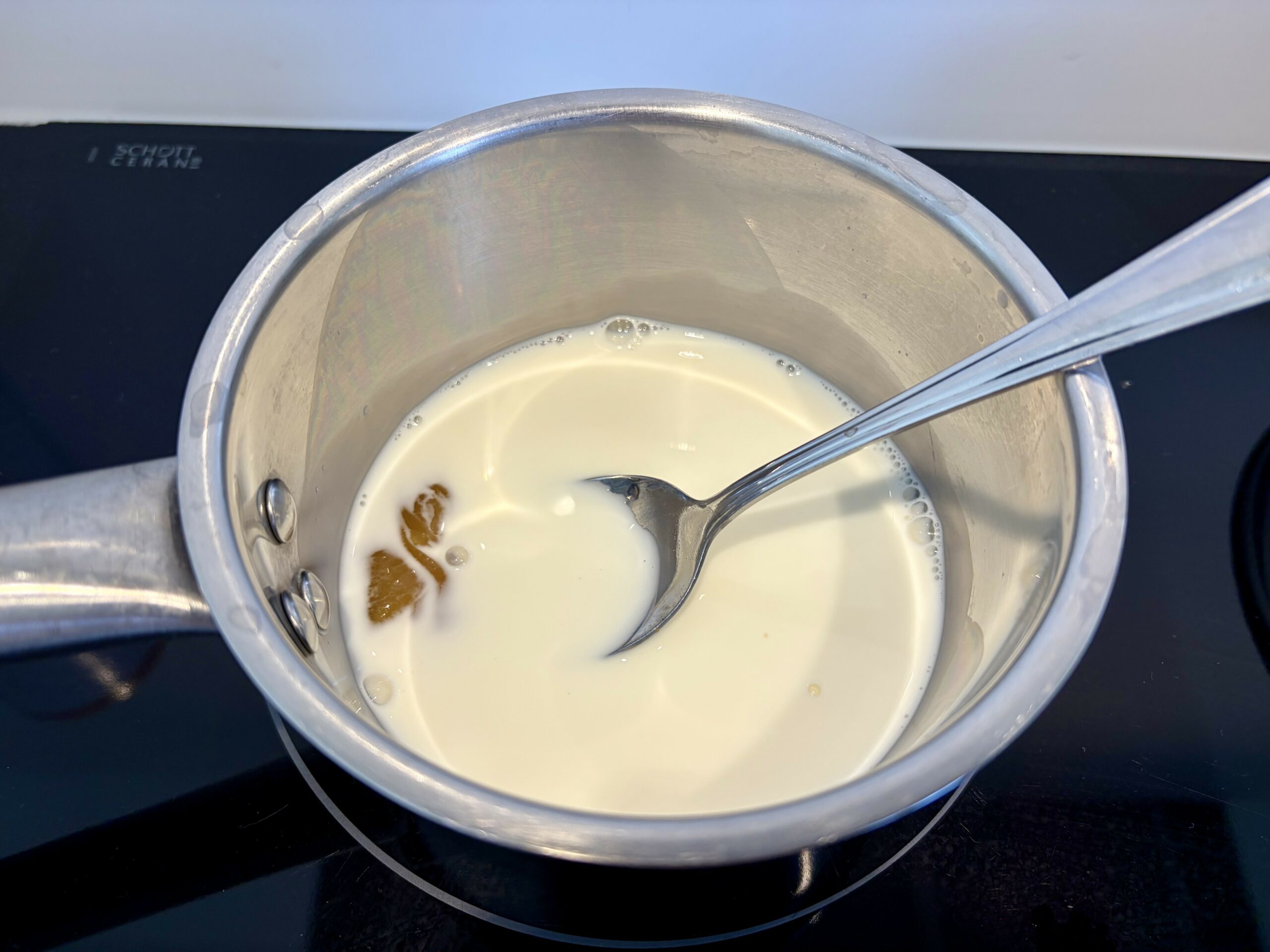 2. Dans une casserole ajoutez le lait et le miel et faites chauffer (sans faire bouillir).