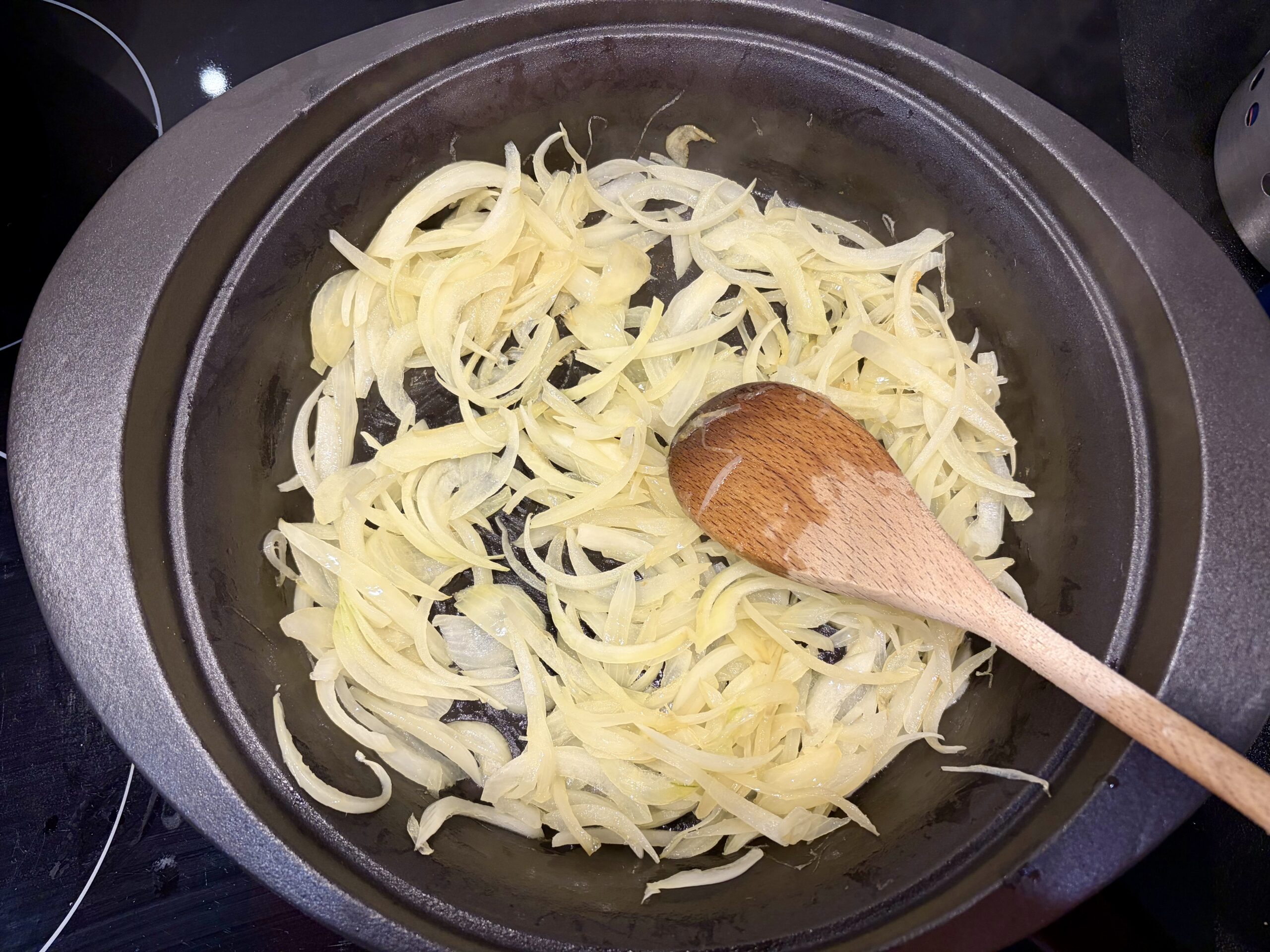 3. Dans un tajine, une grande poêle, ou une cocotte chauffez l’huile d’olive et faites revenir l’oignon émincés environ 15 minutes.