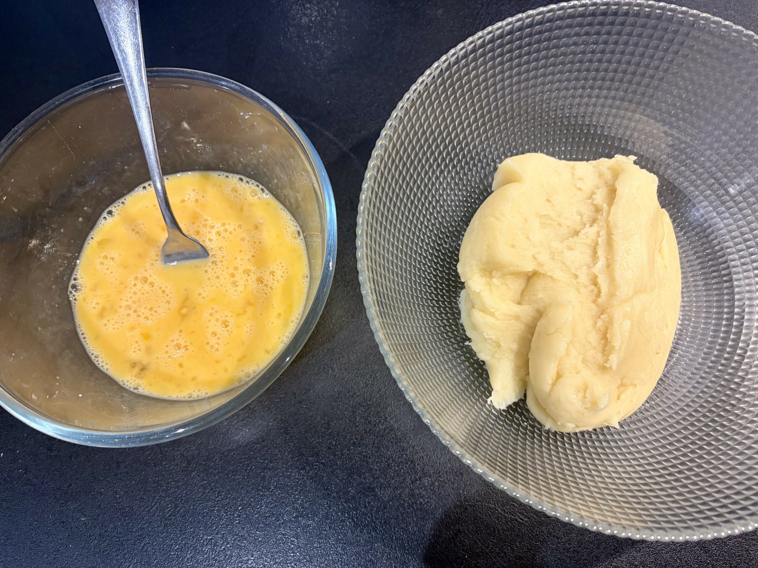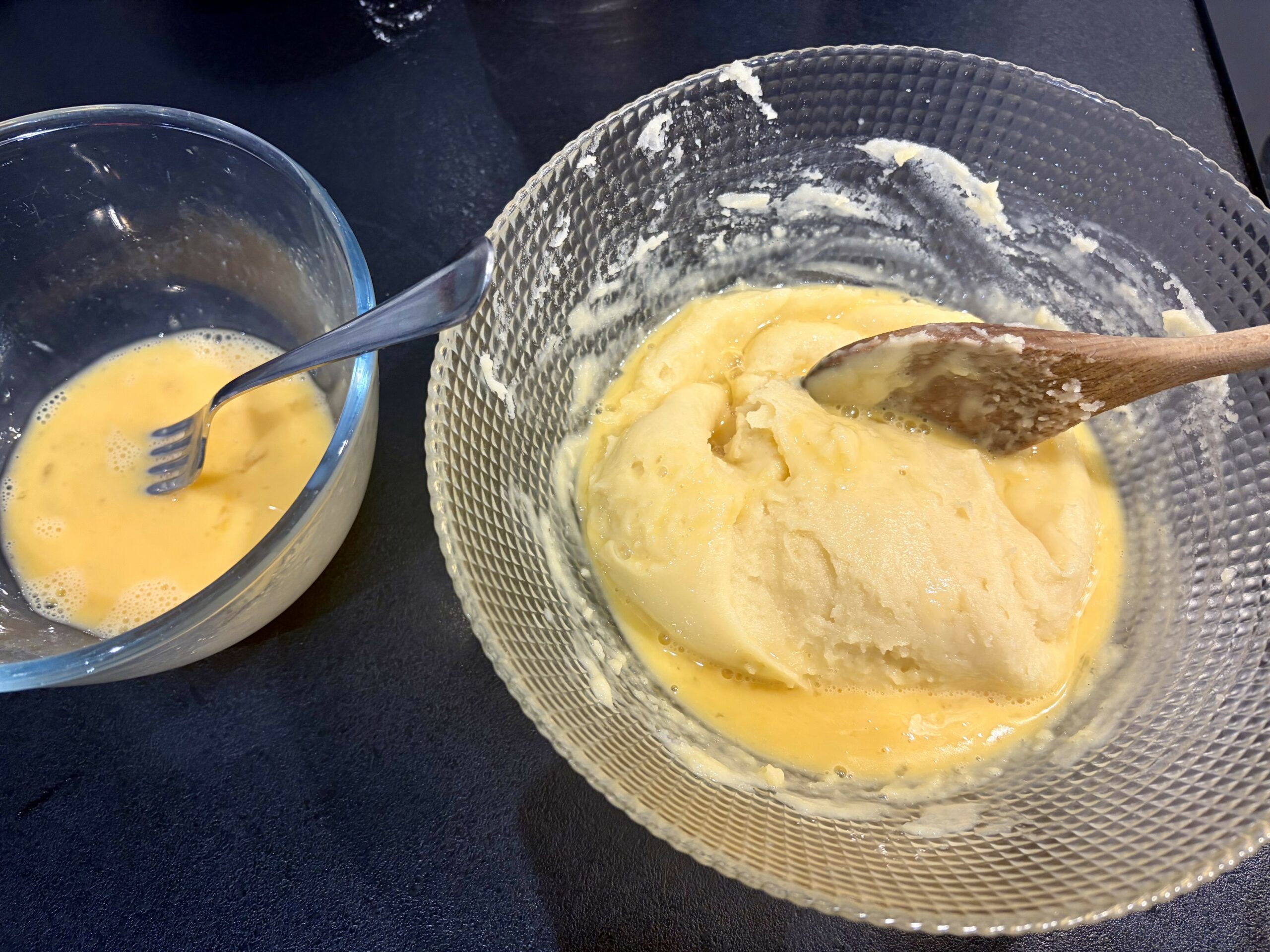 Si votre pâte après l’ajout de 2 oeufs n’atteint pas la bonne consistance, battez un troisième oeuf et continuez l’ajout cuillère à soupe par cuillère a soupe jusqu’à obtenir la consistance souhaitée.